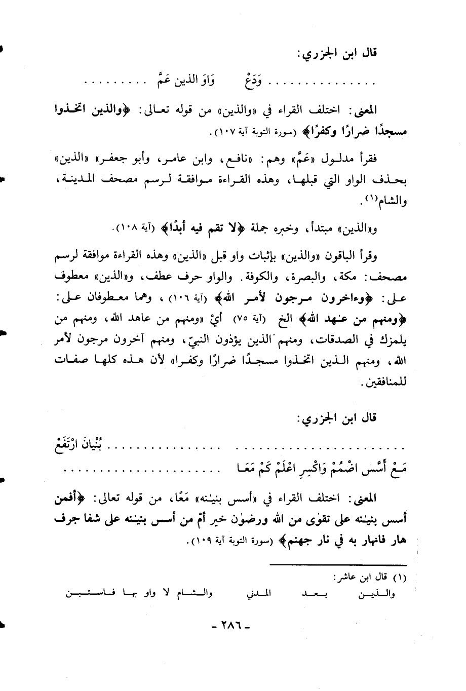 فقرأ مدلول «عمّ» وهم: «نافع، وابن عامر، وأبو جعفر» «الذين» بحذف الواو التي قبلها، وهذه القراءة موافقة لرسم مصحف المدينة، والشام «1».