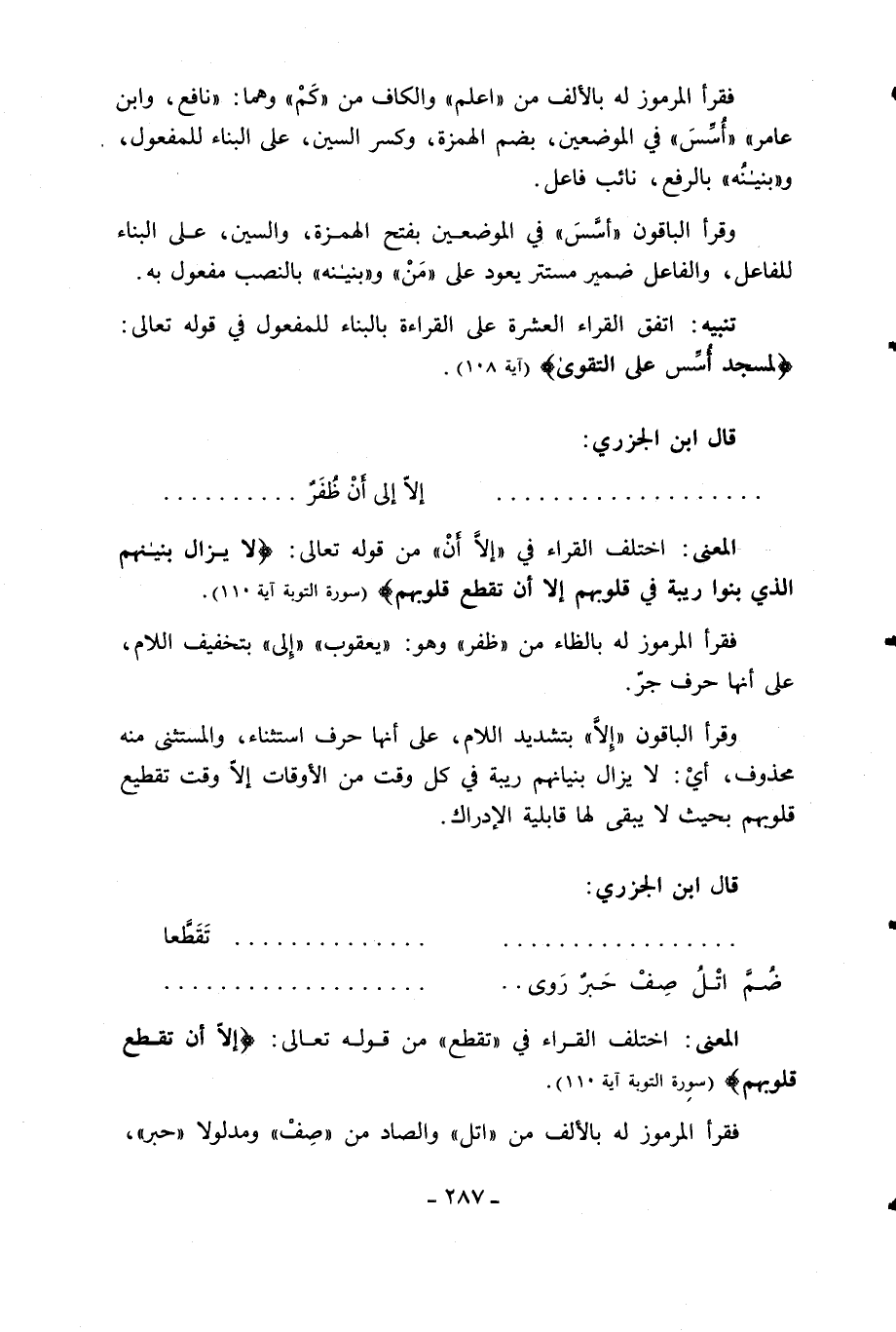 المعنى: اختلف القراء في «تقطع» من قوله تعالى: إِلَّا أَنْ تَقَطَّعَ قُلُوبُهُمْ (سورة التوبة آية 110).