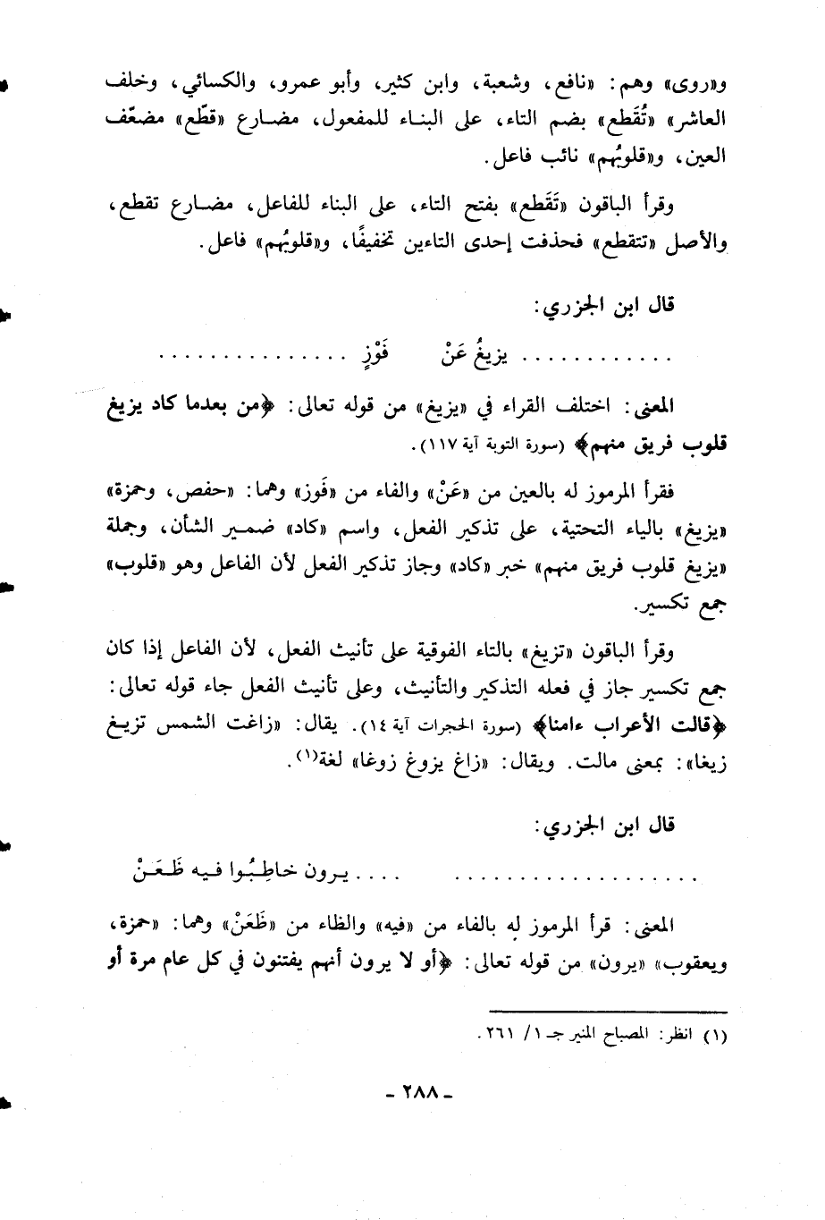 فقرأ المرموز له بالعين من «عن» والفاء من «فوز» وهما: «حفص، وحمزة» «يزيغ» بالياء التحتية، على تذكير الفعل، واسم «كاد» ضمير الشأن، وجملة «يزيغ قلوب فريق منهم» خبر «كاد» وجاز تذكير الفعل لأن الفاعل وهو «قلوب» جمع تكسير.