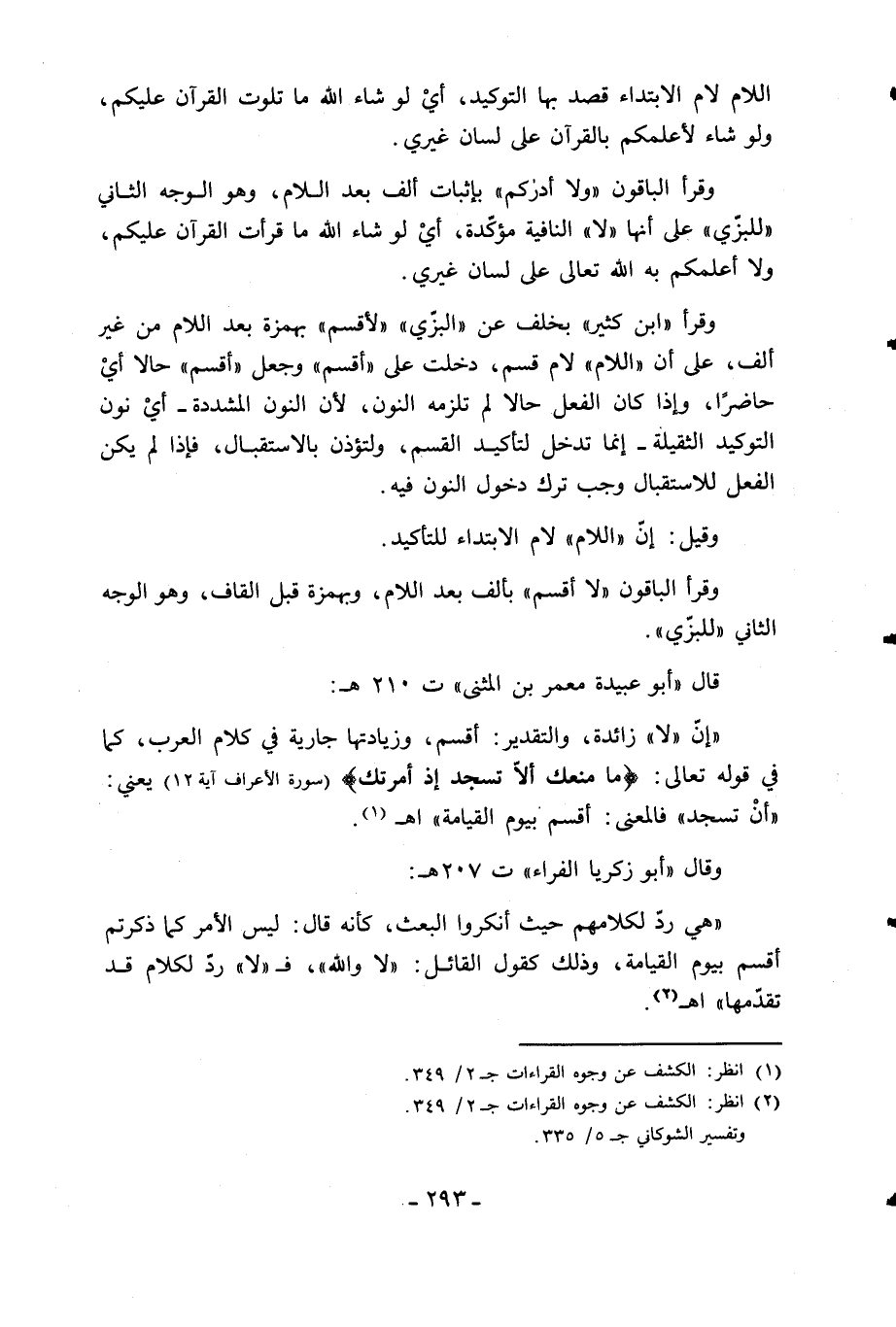وقرأ الباقون «لا أقسم» بألف بعد اللام، وبهمزة قبل القاف، وهو الوجه الثاني «للبزّي».
