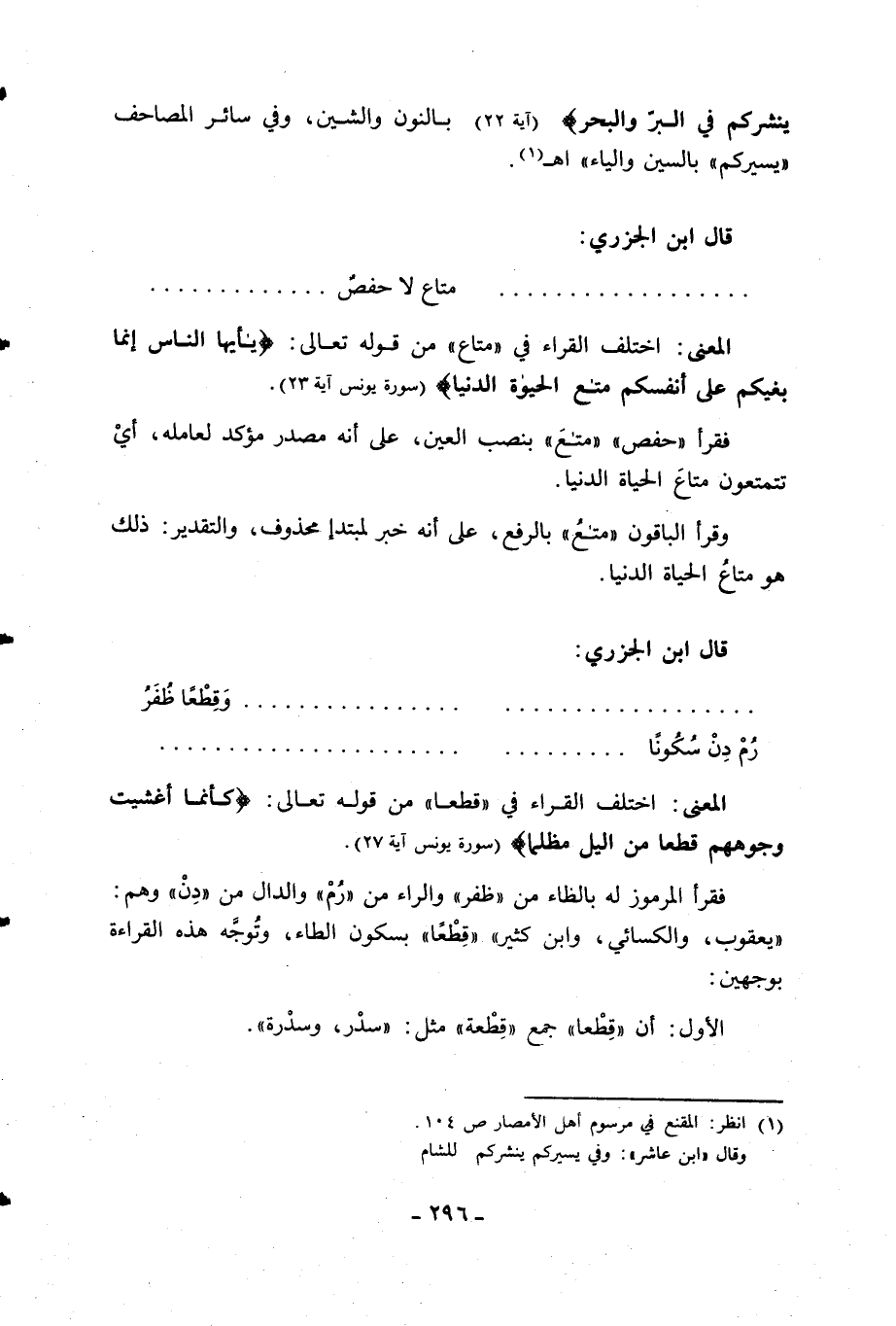 يُسَيِّرُكُمْ فِي الْبَرِّ وَالْبَحْرِ (آية 22). بالنون والشين، وفي سائر المصاحف «يسيركم» بالسين والياء» اهـ- «1».