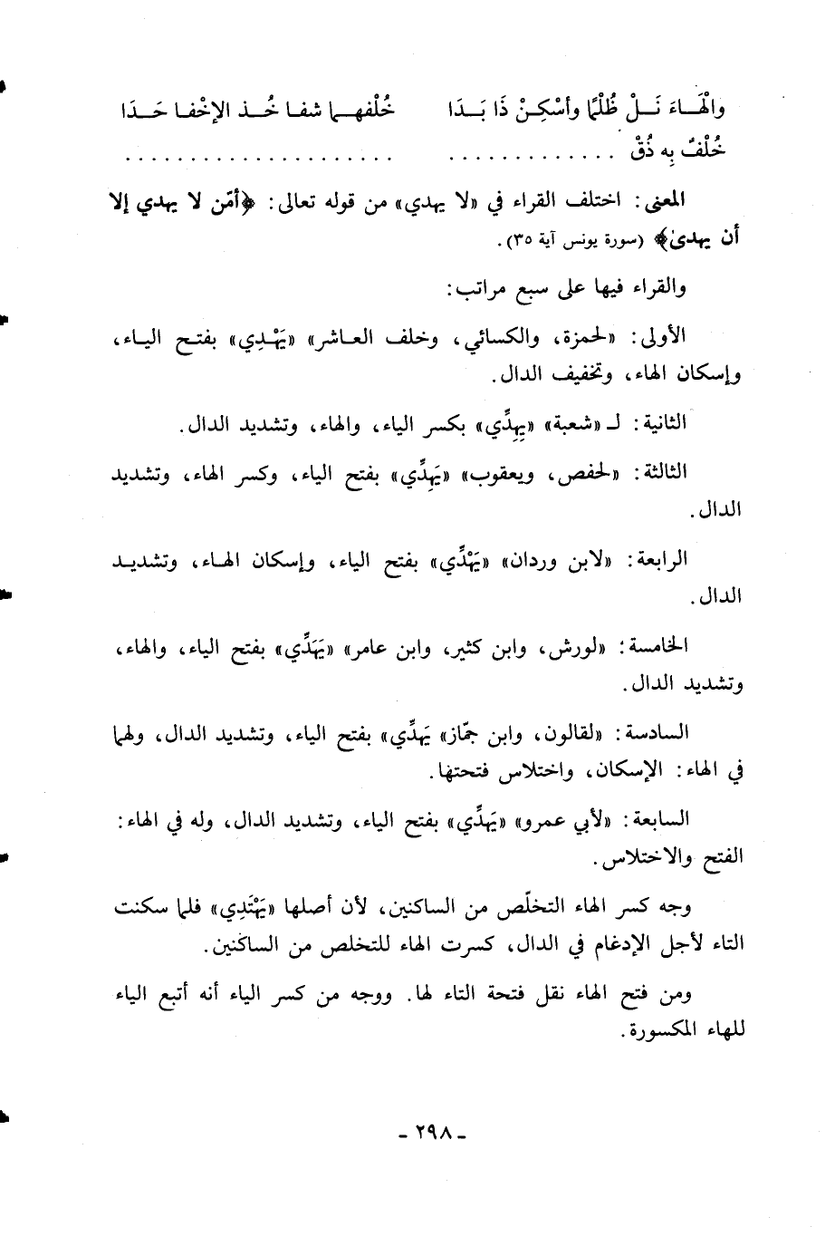 الأولى: «لحمزة، والكسائي، وخلف العاشر» «يهدي» بفتح الياء، وإسكان الهاء، وتخفيف الدال.