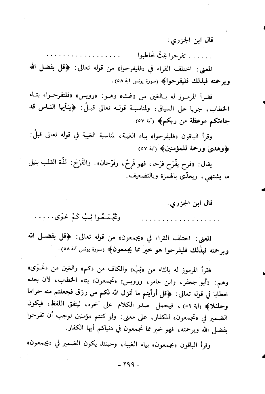 وَهُدىً وَرَحْمَةٌ لِلْمُؤْمِنِينَ (آية 57) يقال: «فرح يفرح فرحا، فهو فرح، وفرحان». والفرح: لذّة القلب بنيل ما يشتهي، ويعدّى بالهمزة وبالتضعيف.