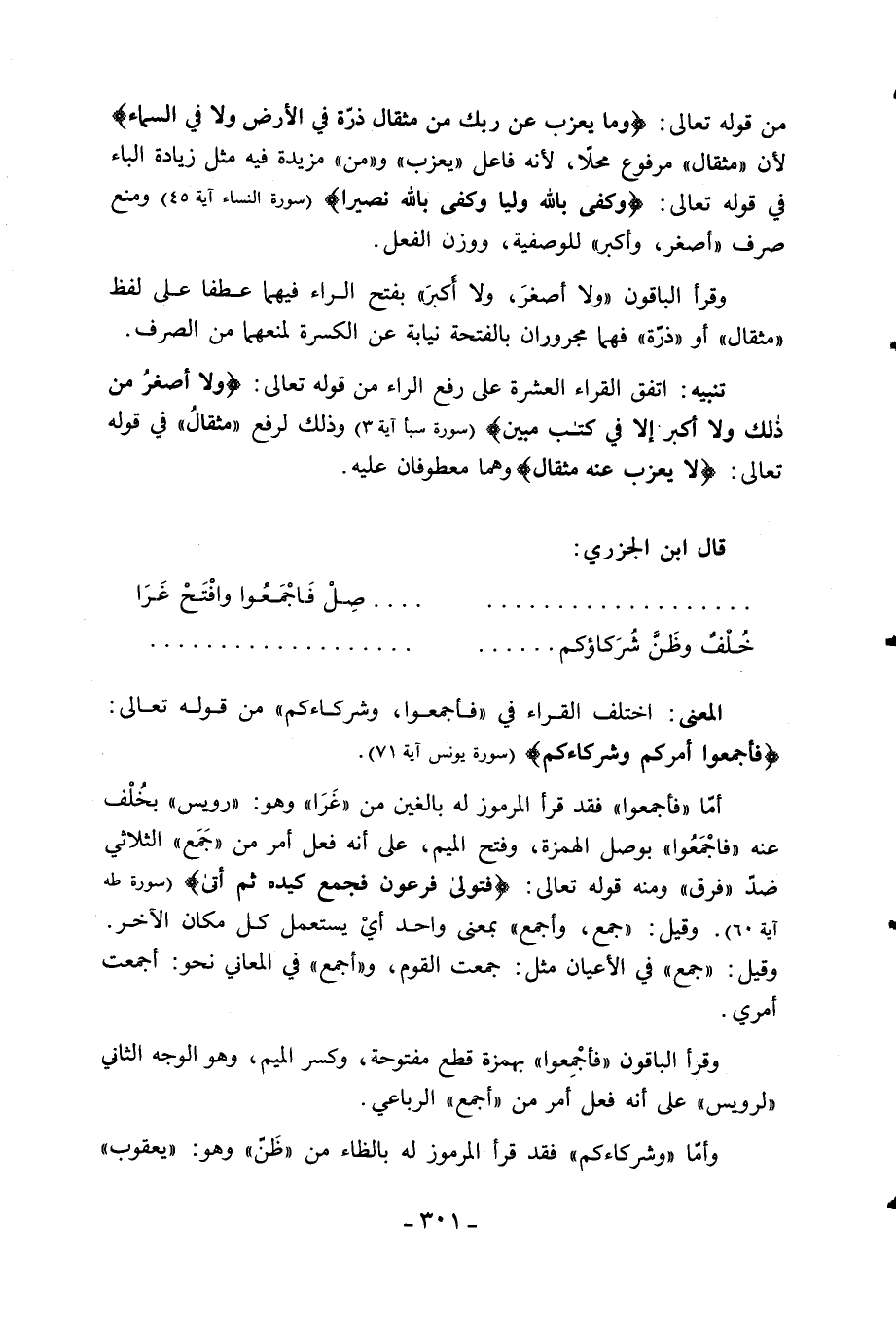 تنبيه: اتفق القراء العشرة على رفع الراء من قوله تعالى: وَلا أَصْغَرُ مِنْ ذلِكَ وَلا أَكْبَرُ إِلَّا فِي كِتابٍ مُبِينٍ (سورة سبأ آية 3). وذلك لرفع «مثقال» في قوله تعالى: لا يَعْزُبُ عَنْهُ مِثْقالُ وهما معطوفان عليه.