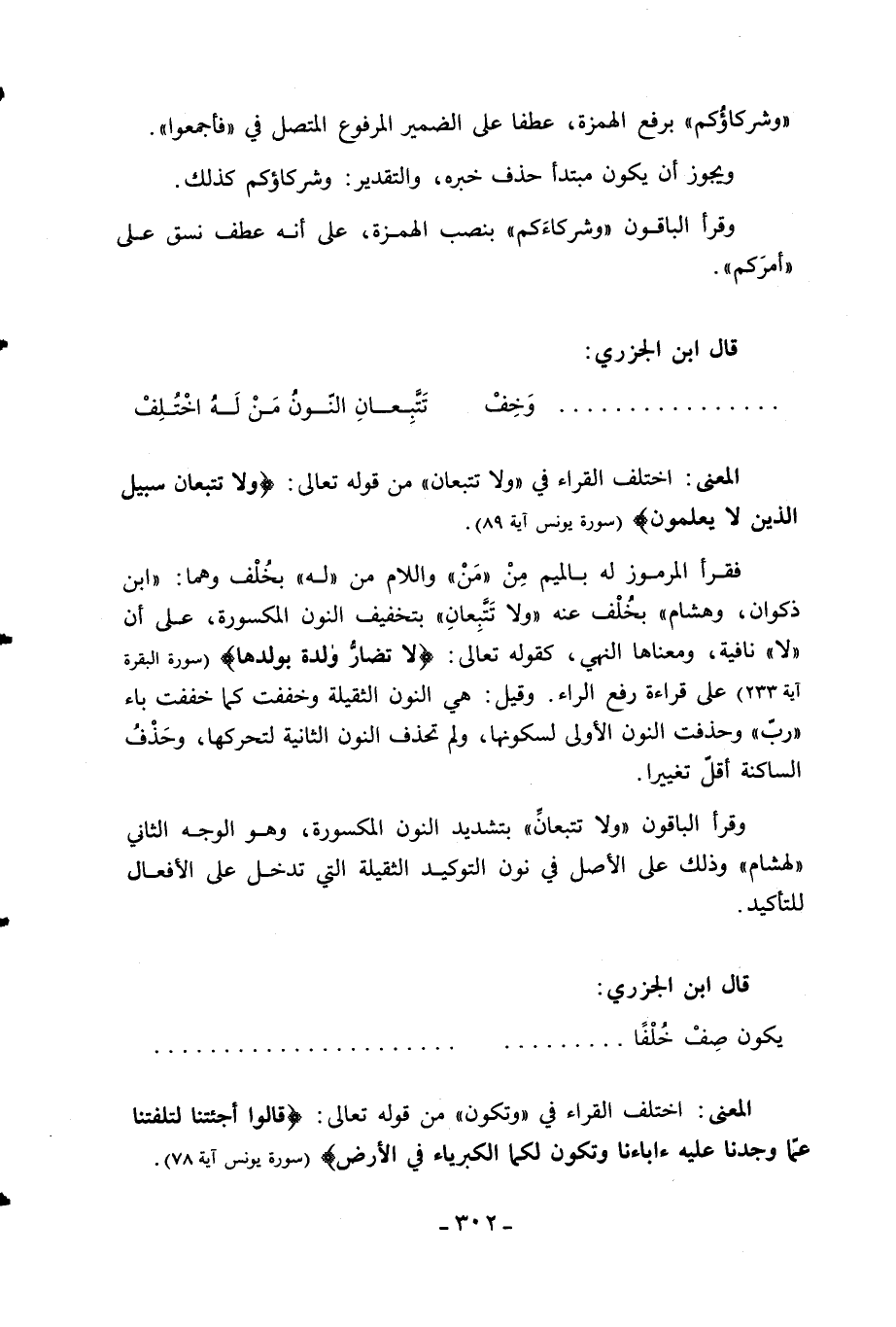 فقرأ المرموز له بالميم من «من» واللام من «له» بخلف وهما: «ابن ذكوان، وهشام» بخلف عنه «ولا تتّبعان» بتخفيف النون المكسورة، على أن «لا» نافية، ومعناها النهي، كقوله تعالى: لا تُضَارَّ والِدَةٌ بِوَلَدِها (سورة البقرة آية 233) على قراءة رفع الراء. وقيل: هي النون الثقيلة وخففت كما خففت باء «ربّ» وحذفت النون الأولى لسكونها، ولم تحذف النون الثانية لتحركها، وحذف الساكنة أقلّ تغييرا.