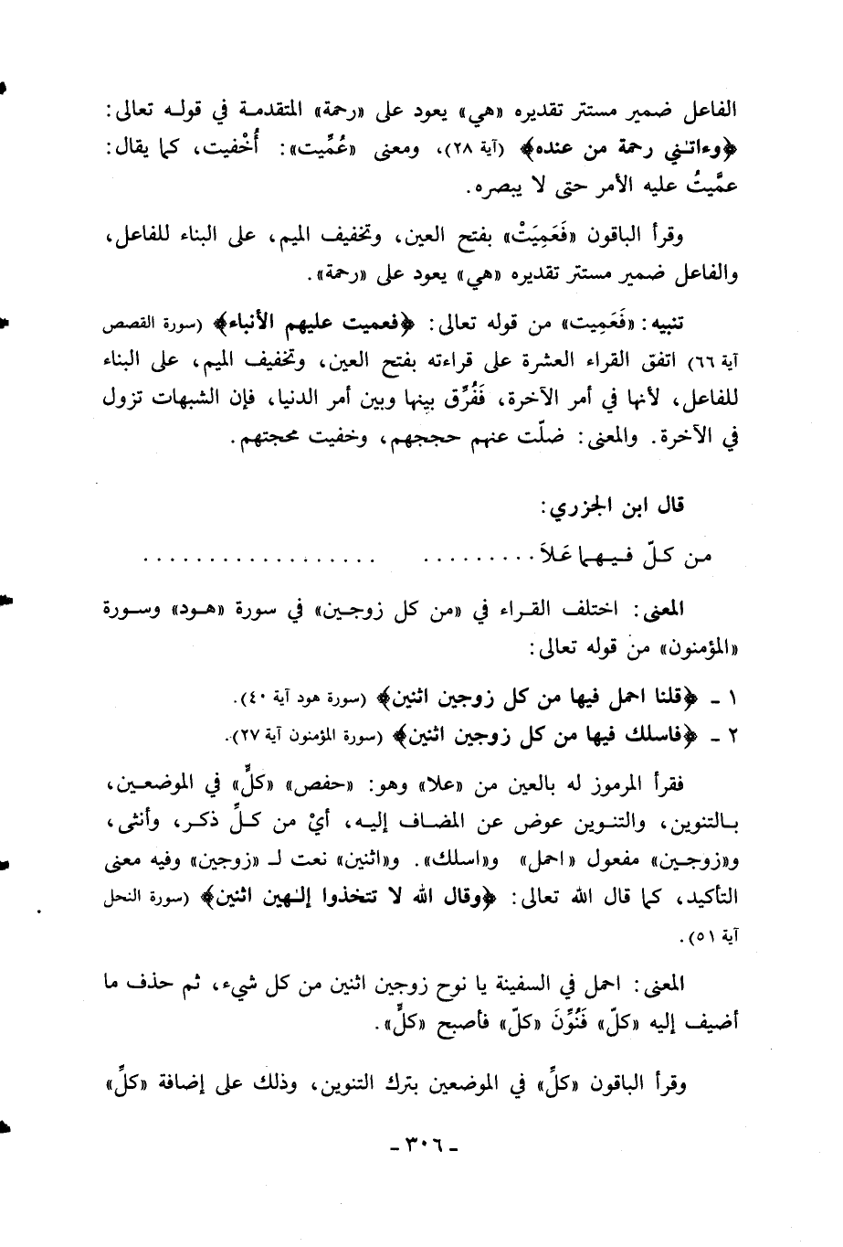 «فعميت» من قوله تعالى: فَعَمِيَتْ عَلَيْهِمُ الْأَنْباءُ (سورة القصص آية 66) اتفق القراء العشرة على قراءته بفتح العين، وتخفيف الميم، على البناء للفاعل، لأنها في أمر الآخرة، ففرّق بينها وبين أمر الدنيا، فإن الشبهات تزول في الآخرة. والمعنى: ضلّت عنهم حججهم، وخفيت محجتهم.