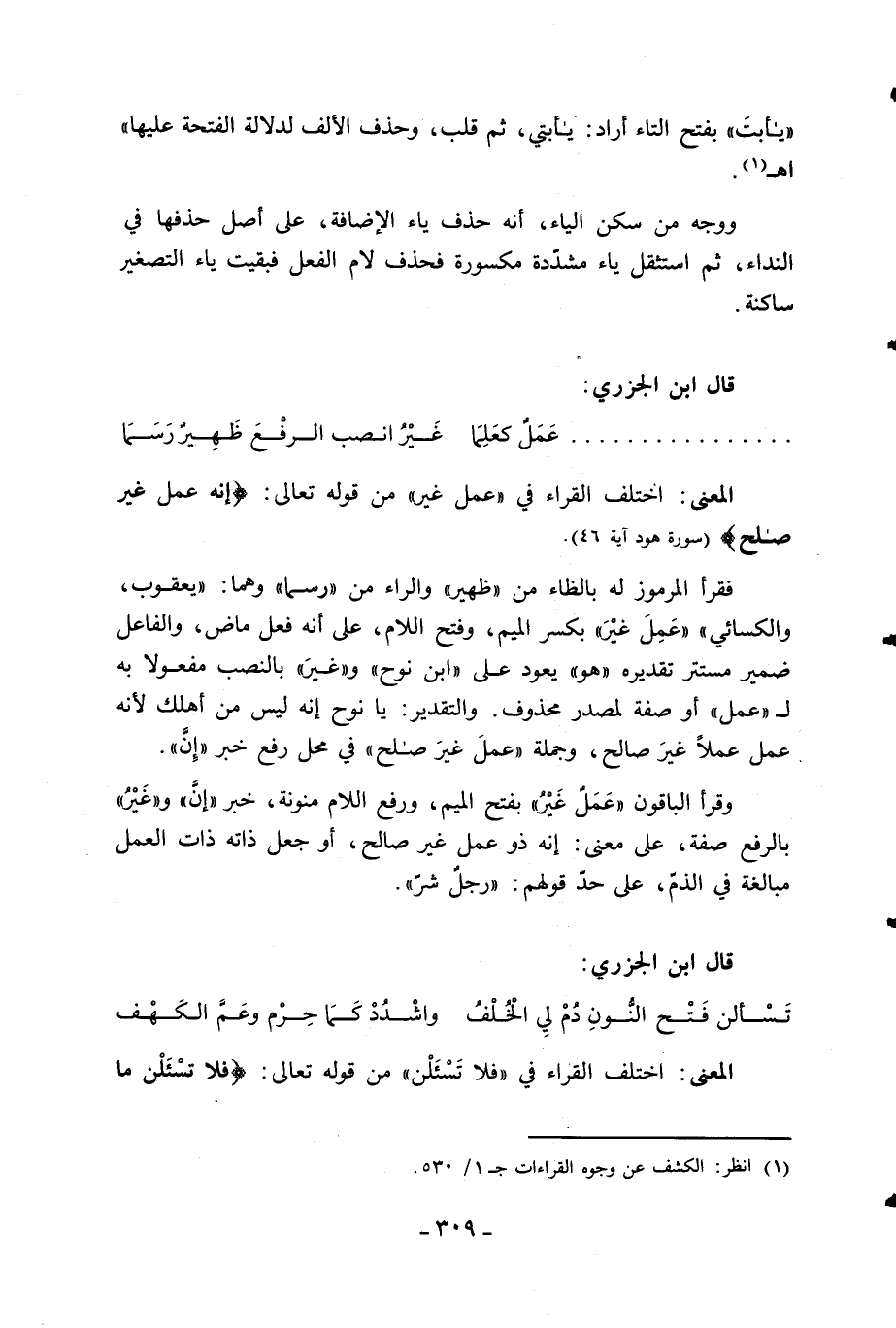 وقرأ الباقون «عمل غير» بفتح الميم، ورفع اللام منونة، خبر «إنّ» و «غير» بالرفع صفة، على معنى: إنه ذو عمل غير صالح، أو جعل ذاته ذات العمل مبالغة في الذمّ، على حدّ قولهم: «رجل شرّ».