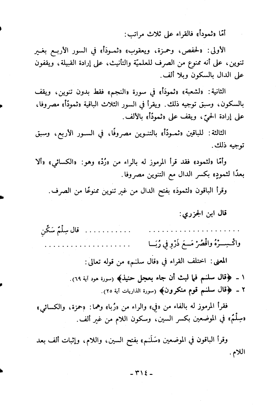 الأولى: «لحفص، وحمزة، ويعقوب» «ثمودا» في السور الأربع بغير تنوين، على أنه ممنوع من الصرف للعلميّة والتأنيث، على إرادة القبيلة، ويقفون على الدال بالسكون وبلا ألف.