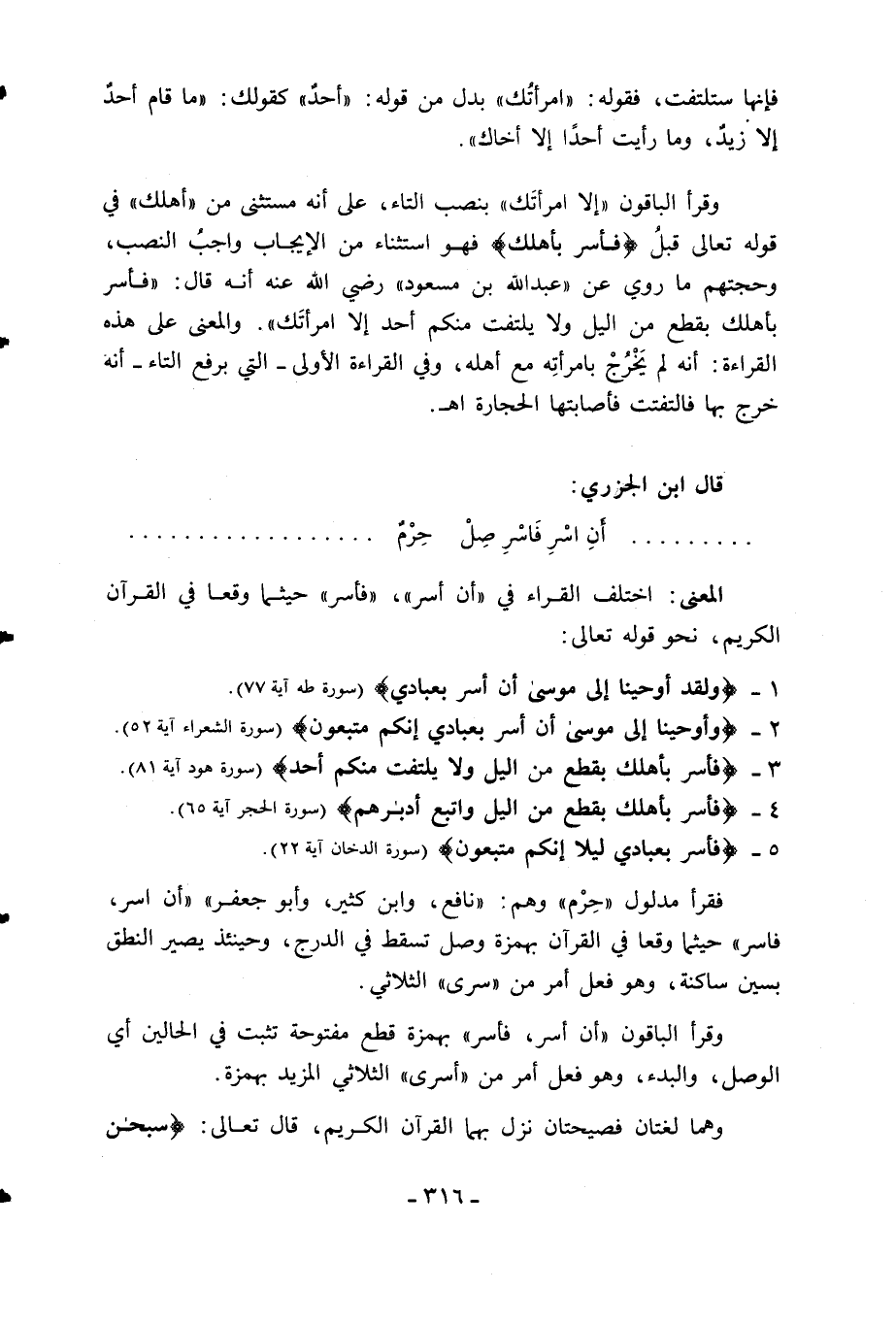 وقرأ الباقون «أن أسر، فأسر» بهمزة قطع مفتوحة تثبت في الحالين أي الوصل، والبدء، وهو فعل أمر من «أسرى» الثلاثي المزيد بهمزة.