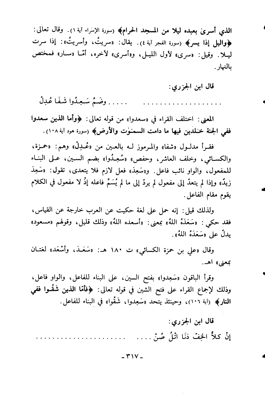 فقرأ مدلول «شفا» والمرموز له بالعين من «عدل» وهم: «حمزة، والكسائي، وخلف العاشر، وحفص» «سعدوا» بضم السين، على البناء للمفعول، والواو نائب فاعل. و «سعد» فعل لازم فلا يتعدى، تقول: «سعد زيد» وإذا لم يتعدّ إلى مفعول لم يردّ إلى ما لم يسمّ فاعله إذ لا مفعول في الكلام يقوم مقام الفاعل.