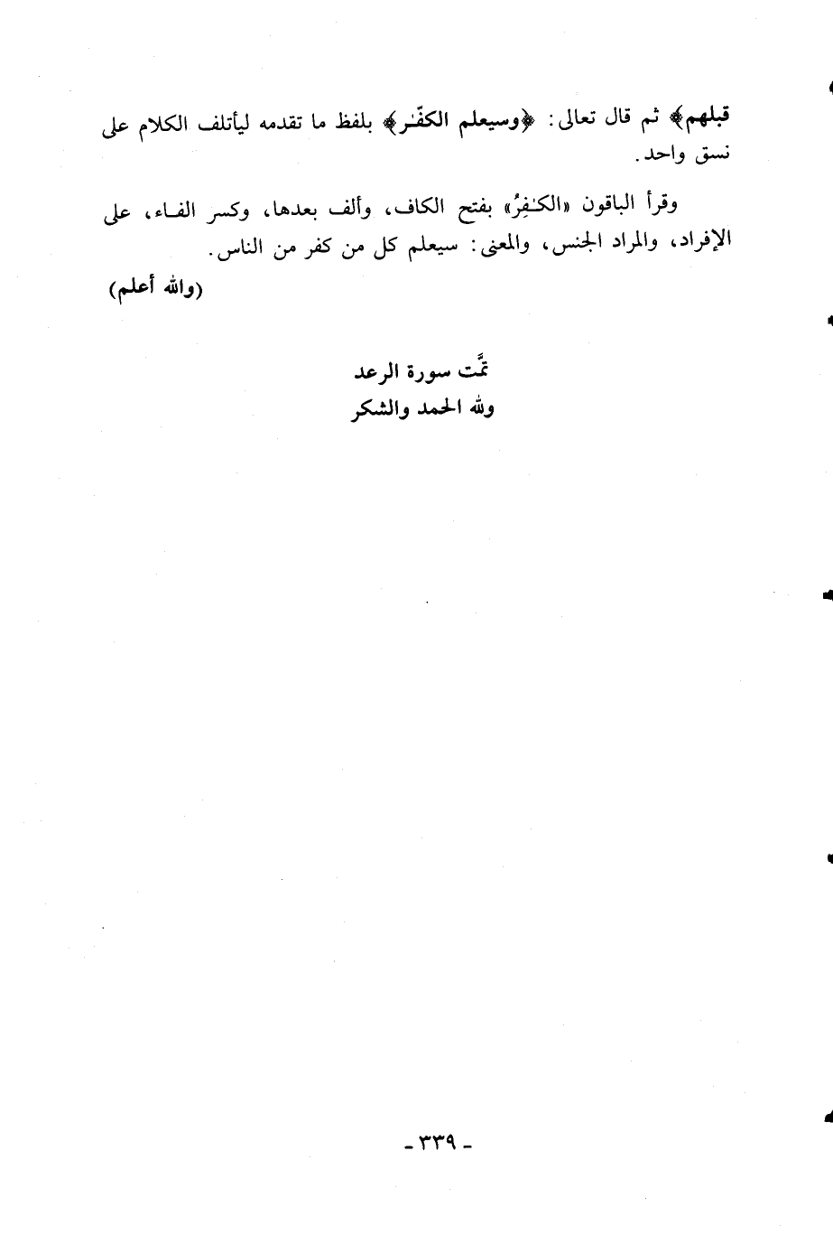 (والله أعلم) تمّت سورة الرعد ولله الحمد والشكر