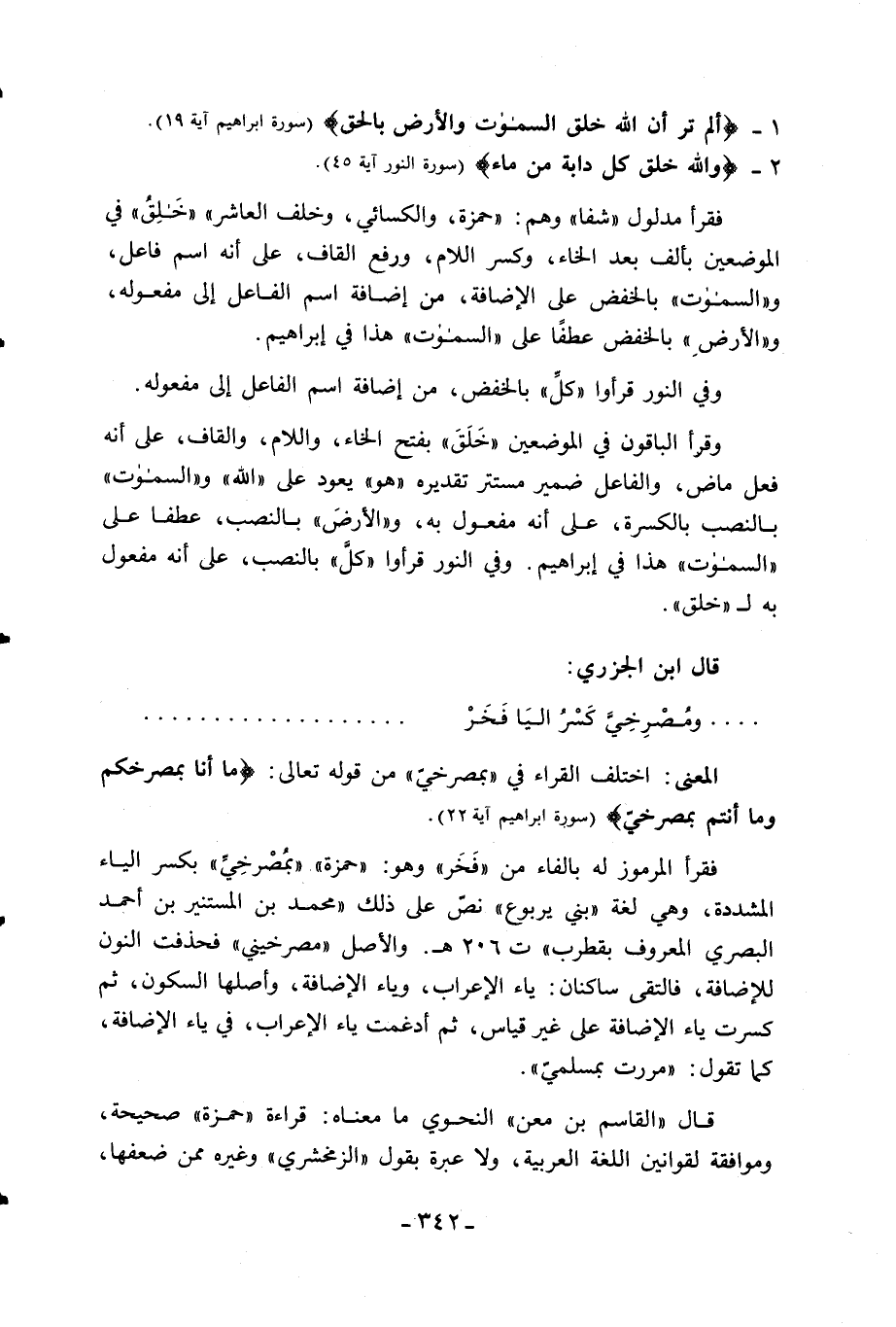 وقرأ الباقون في الموضعين «خلق» بفتح الخاء، واللام، والقاف، على أنه فعل ماض، والفاعل ضمير مستتر تقديره «هو» يعود على «الله» و «السماوات» بالنصب بالكسرة، على أنه مفعول به، و «الأرض» بالنصب، عطفا على «السماوات» هذا في إبراهيم. وفي النور قرءوا «كلّ» بالنصب، على أنه مفعول به ل «خلق».