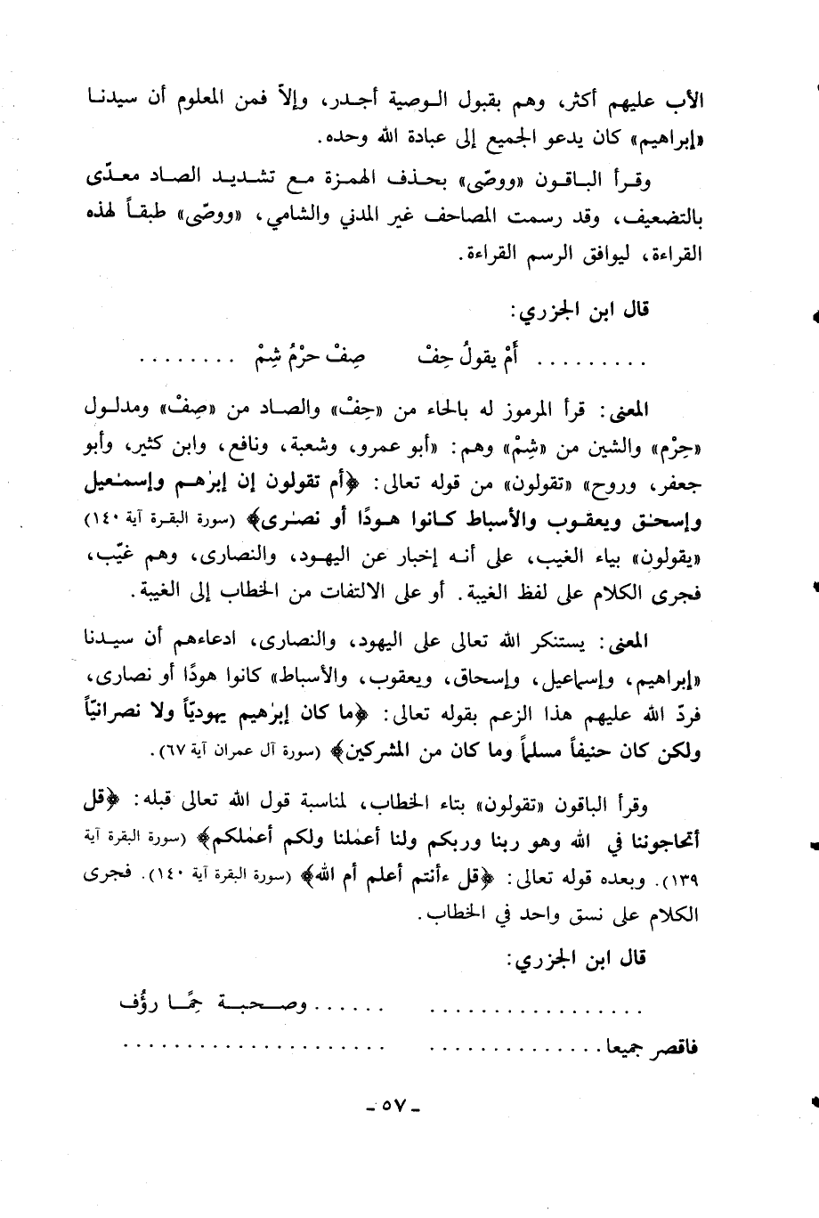 المعنى: قرأ المرموز له بالحاء من «حف» والصاد من «صف» ومدلول «حرم» والشين من «شم» وهم: «أبو عمرو، وشعبة، ونافع، وابن كثير، وأبو جعفر، وروح» «تقولون» من قوله تعالى: أَمْ تَقُولُونَ إِنَّ إِبْراهِيمَ وَإِسْماعِيلَ وَإِسْحاقَ وَيَعْقُوبَ وَالْأَسْباطَ كانُوا هُوداً أَوْ نَصارى (سورة البقرة آية 140).
