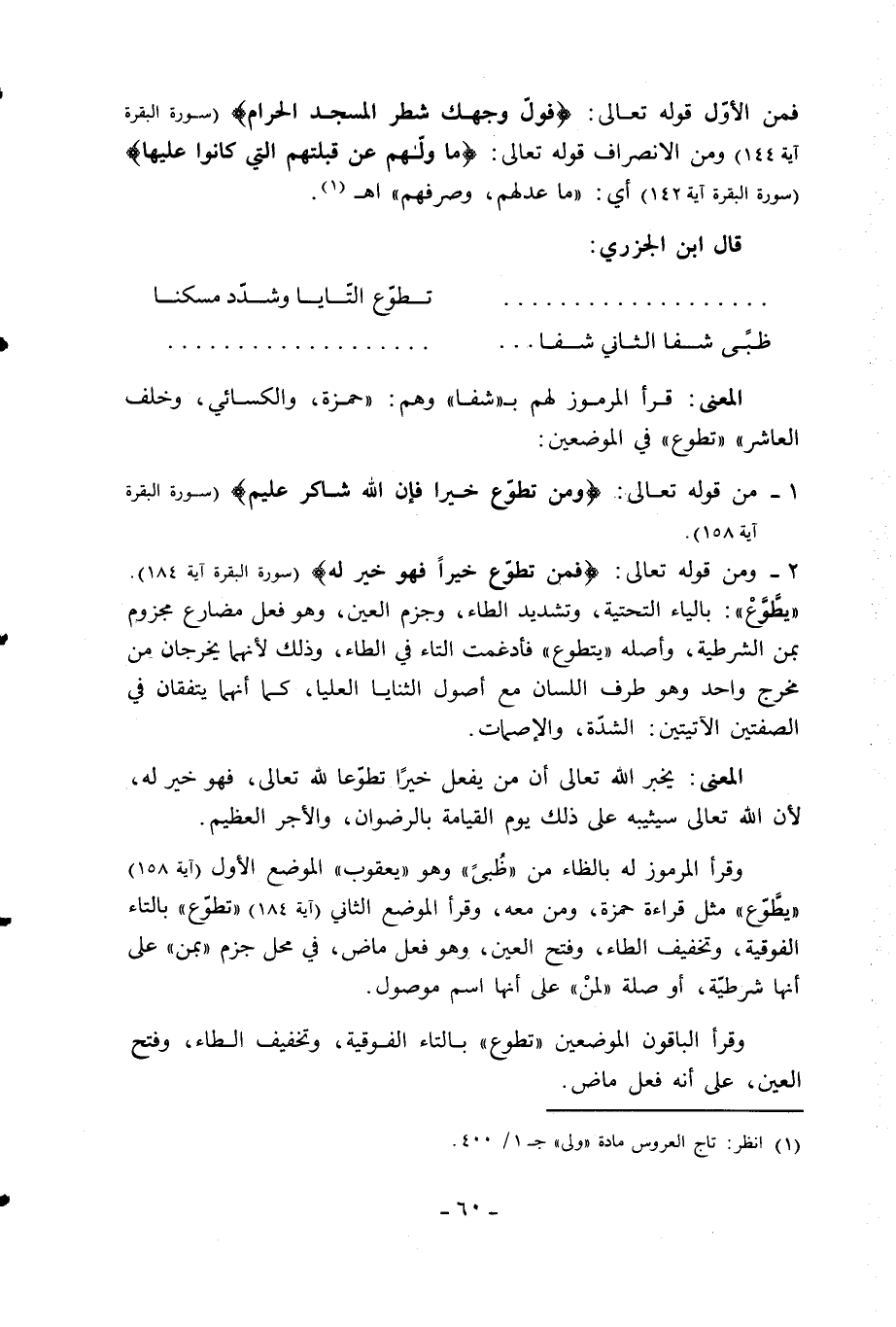 وقرأ المرموز له بالظاء من «ظبى» وهو «يعقوب» الموضع الأول (آية 158) «يطّوّع» مثل قراءة حمزة، ومن معه، وقرأ الموضع الثاني (آية 184) «تطوّع» بالتاء الفوقية، وتخفيف الطاء، وفتح العين، وهو فعل ماض، في محل جزم «بمن» على أنها شرطيّة، أو صلة «لمن» على أنها اسم موصول.