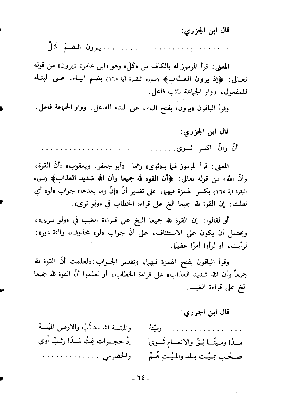 المعنى: قرأ المرموز لهما ب «ثوى» وهما: «أبو جعفر، ويعقوب» «أنّ القوة، وأنّ الله» من قوله تعالى: أَنَّ الْقُوَّةَ لِلَّهِ جَمِيعاً وَأَنَّ اللَّهَ شَدِيدُ الْعَذابِ (سورة البقرة آية 165) بكسر الهمزة فيهما، على تقدير أنّ «إنّ وما بعدها» جواب «لو» أي لقلت: إن القوة لله جميعا الخ على قراءة الخطاب في «ولو ترى».