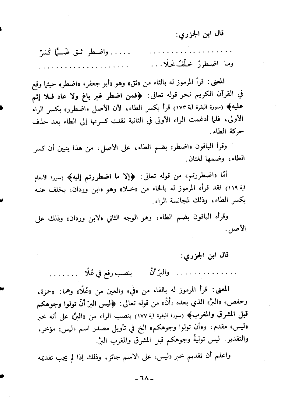 المعنى: قرأ المرموز له بالثاء من «ثق» وهو «أبو جعفر» «اضطر» حيثما وقع في القرآن الكريم نحو قوله تعالى: فَمَنِ اضْطُرَّ غَيْرَ باغٍ وَلا عادٍ فَلا إِثْمَ عَلَيْهِ (سورة البقرة آية 173) قرأ بكسر الطاء، لأن الأصل «اضطرر» بكسر الراء الأولى، فلما أدغمت الراء الأولى في الثانية نقلت كسرتها إلى الطاء بعد حذف حركة الطاء.