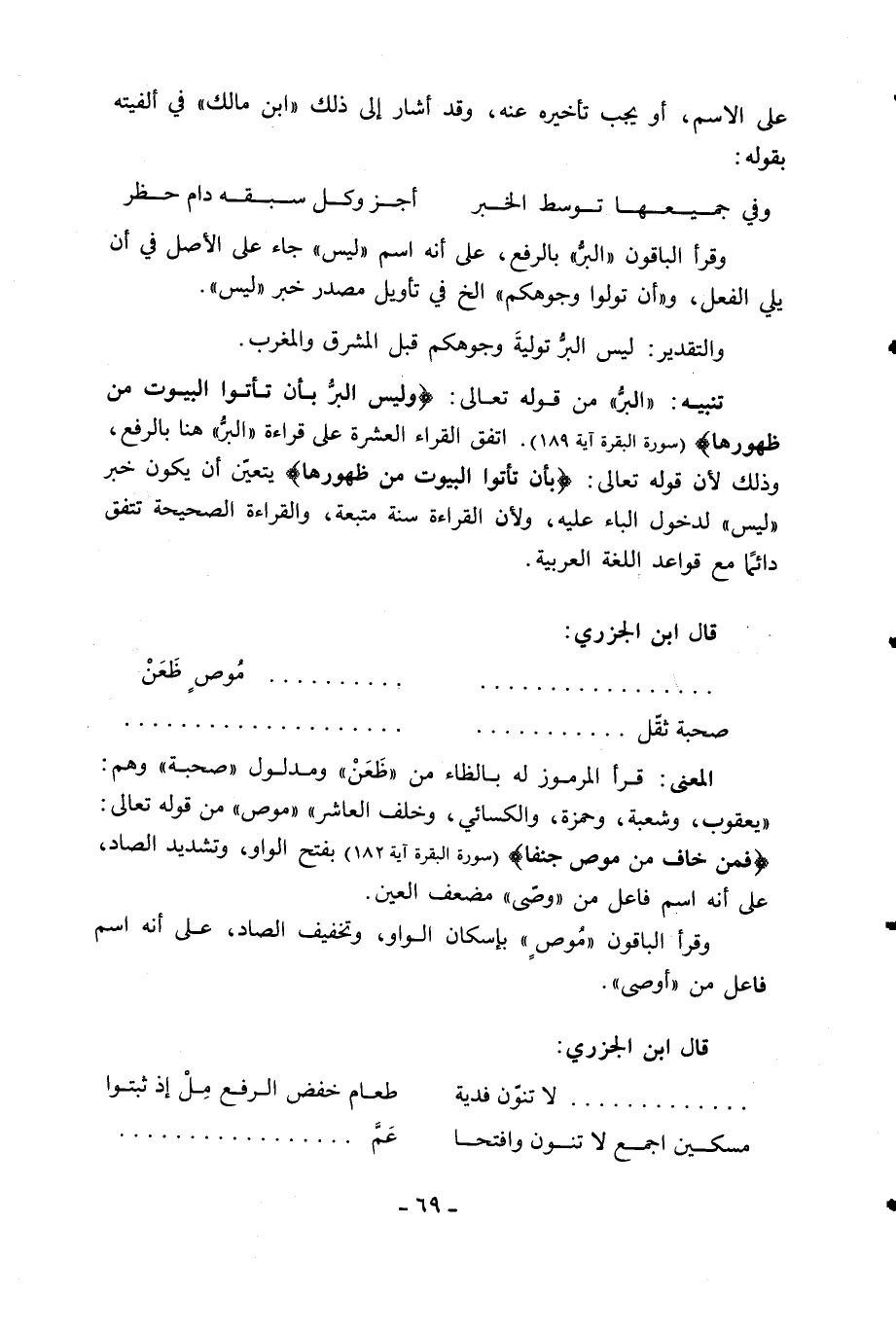 «البرّ» من قوله تعالى: وَلَيْسَ الْبِرُّ بِأَنْ تَأْتُوا الْبُيُوتَ مِنْ ظُهُورِها (سورة البقرة آية 189). اتفق القراء العشرة على قراءة «البرّ» هنا بالرفع، وذلك لأن قوله تعالى: بِأَنْ تَأْتُوا الْبُيُوتَ مِنْ ظُهُورِها يتعيّن أن يكون خبر «ليس» لدخول الباء عليه، ولأن القراءة سنة متبعة، والقراءة الصحيحة تتفق دائما مع قواعد اللغة العربية.