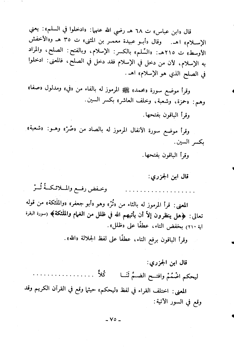 قال «ابن عباس» ت 68 هـ رضي الله عنهما: «ادخلوا في السلم»: يعني الإسلام» اهـ وقال «أبو عبيدة معمر بن المثنى» ت 35 هـ و «الأخفش الأوسط» ت 215 هـ: «السّلم» بالكسر: الإسلام، وبالفتح: الصلح، والمراد به الإسلام، لأن من دخل في الإسلام فقد دخل في الصلح، فالمعنى: ادخلوا في الصلح الذي هو الإسلام» اهـ.