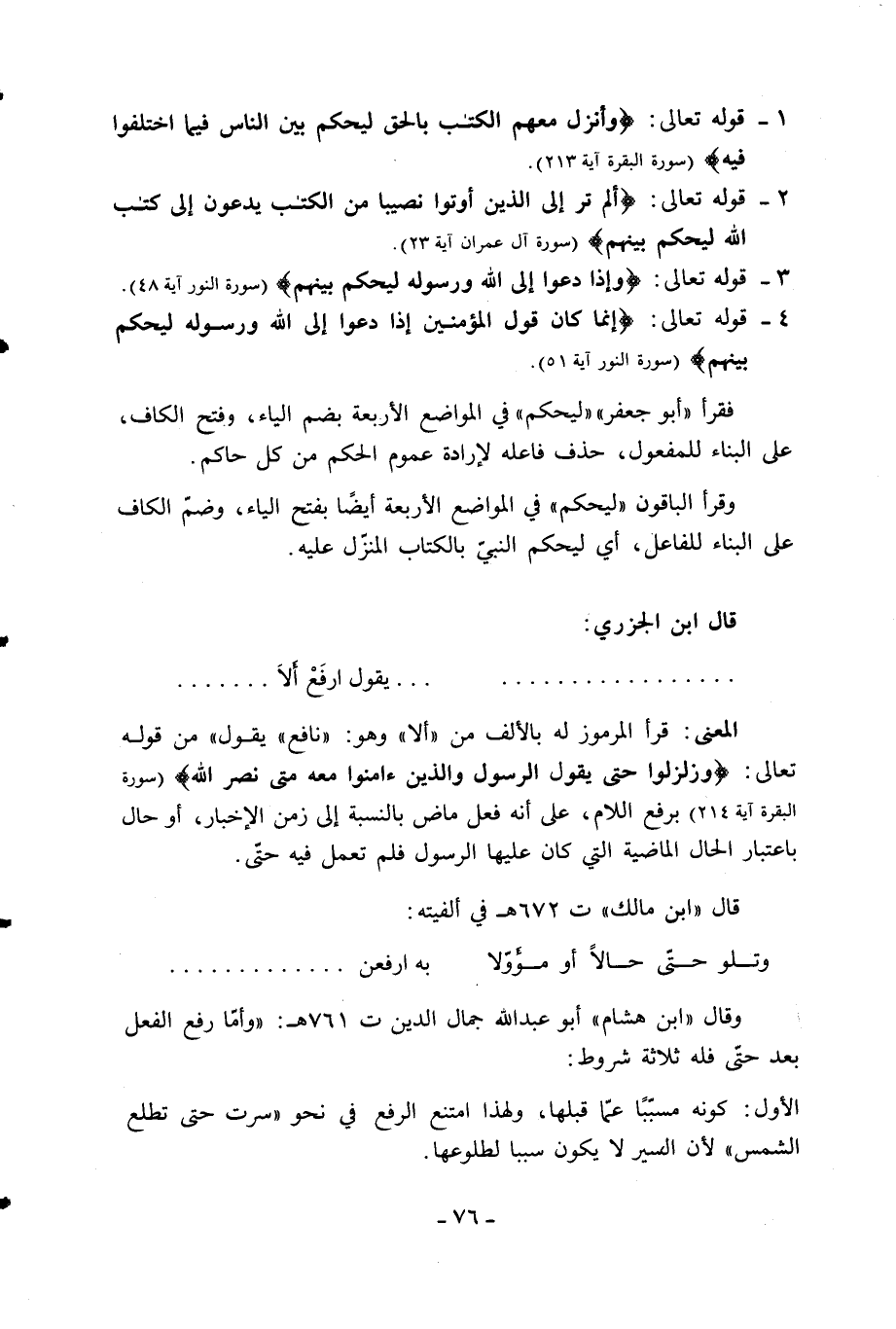 المعنى: قرأ المرموز له بالألف من «ألا» وهو: «نافع» يقول «من قوله تعالى: وَزُلْزِلُوا حَتَّى يَقُولَ الرَّسُولُ وَالَّذِينَ آمَنُوا مَعَهُ مَتى نَصْرُ اللَّهِ (سورة البقرة آية 214) برفع اللام، على أنه فعل ماض بالنسبة إلى زمن الإخبار، أو حال باعتبار الحال الماضية التي كان عليها الرسول فلم تعمل فيه حتّى.