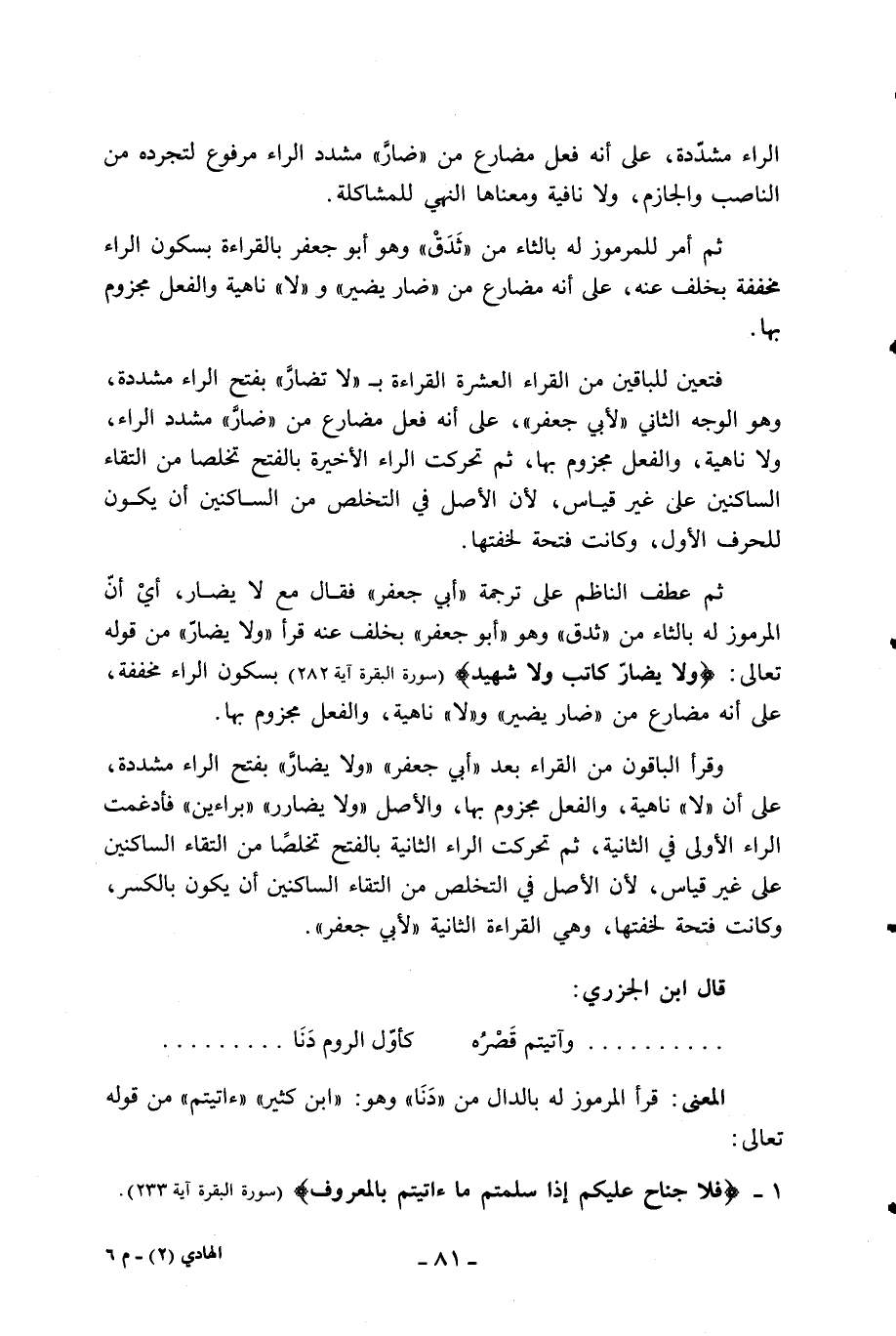 ثم عطف الناظم على ترجمة «أبي جعفر» فقال مع لا يضار، أي أنّ المرموز له بالثاء من «ثدق» وهو «أبو جعفر» بخلف عنه قرأ «ولا يضارّ» من قوله تعالى: وَلا يُضَارَّ كاتِبٌ وَلا شَهِيدٌ (سورة البقرة آية 282) بسكون الراء مخففة، على أنه مضارع من «ضار يضير» و «لا» ناهية، والفعل مجزوم بها.