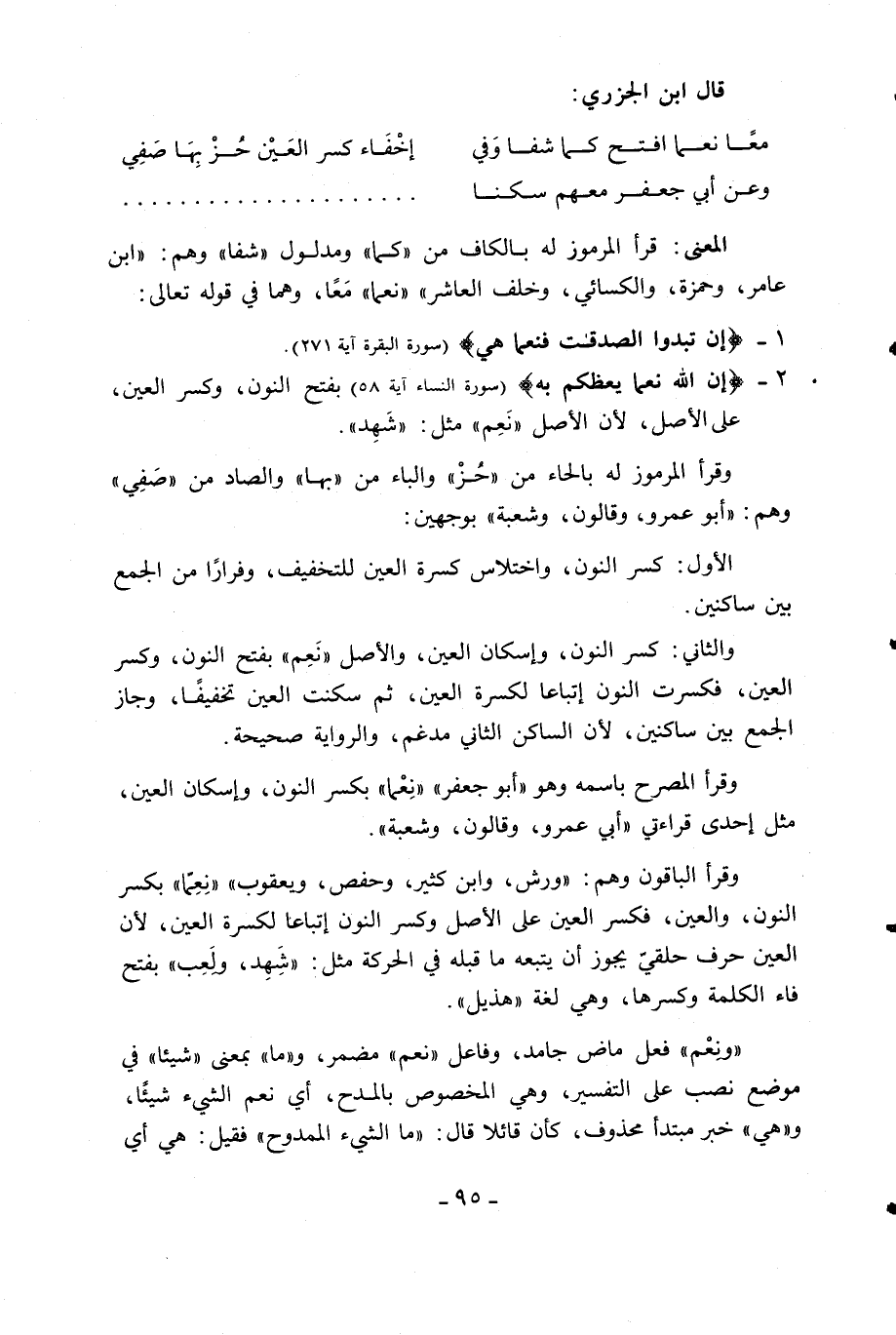 2 - إِنَّ اللَّهَ نِعِمَّا يَعِظُكُمْ بِهِ (سورة النساء آية 58) بفتح النون، وكسر العين، على الأصل، لأن الأصل «نعم» مثل: «شهد».