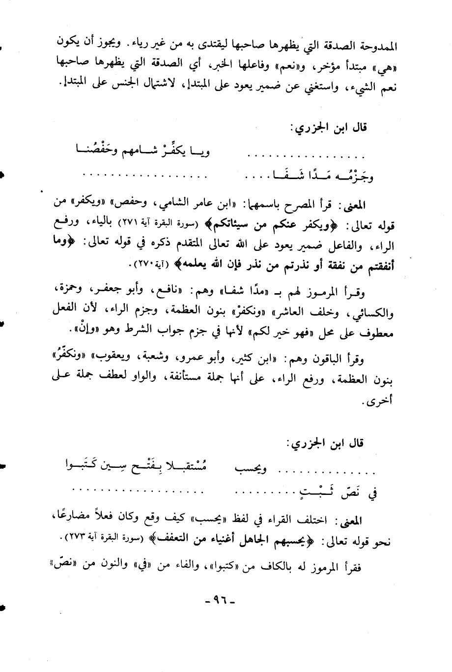 المعنى: قرأ المصرح باسمهما: «ابن عامر الشامي، وحفص» «ويكفر» من قوله تعالى: وَيُكَفِّرُ عَنْكُمْ مِنْ سَيِّئاتِكُمْ (سورة البقرة آية 271) بالياء، ورفع الراء، والفاعل ضمير يعود على الله تعالى المتقدم ذكره في قوله تعالى: وَما أَنْفَقْتُمْ مِنْ نَفَقَةٍ أَوْ نَذَرْتُمْ مِنْ نَذْرٍ فَإِنَّ اللَّهَ يَعْلَمُهُ (آية 270).