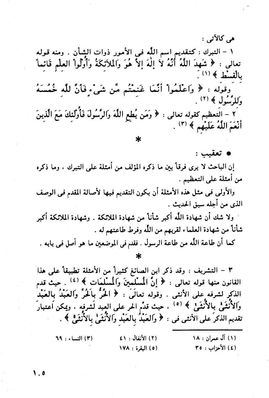 1 - التبرك: كتقديم اسم الله في الأمور ذوات الشأن. ومنه قوله