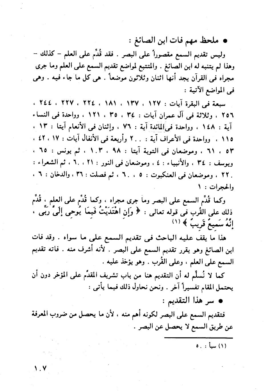 وهذا لم يتنبه له ابن الصائغ. والمتتبع لمواضع تقديم السمع على العلم وما جرى مجراه في القرآن يجد أنها اثنان وثلاثون موضعاً.