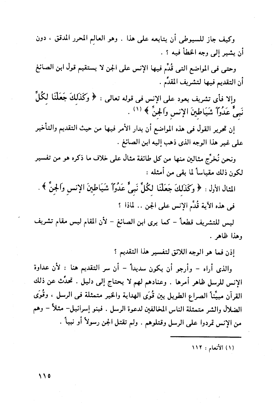 المثال الأول: (وَكَذَلِكَ جَعَلْنَا لِكُلِّ نَبِيٍّ عَدُوًّا شَيَاطِينَ الْإِنْسِ وَالْجِنِّ) .