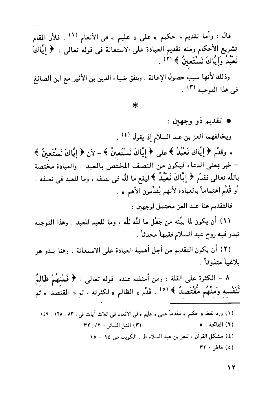 تشريع الأحكام ومنه تقديم العبادة على الاستعانة في قوله تعالى: (إِيَّاكَ نَعْبُدُ وَإِيَّاكَ نَسْتَعِينُ (5) .
