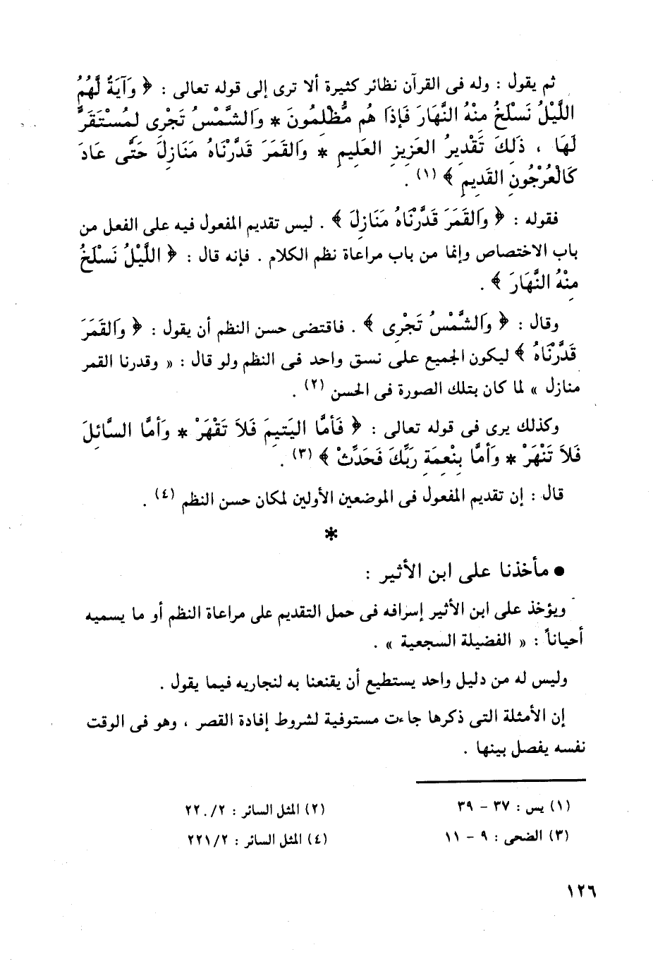 ويؤخذ على ابن الأثير إسرافه في حمل التقديم على مراعاة: النظم أو ما يسميه أحياناً: " الفضيلة السجعية ".