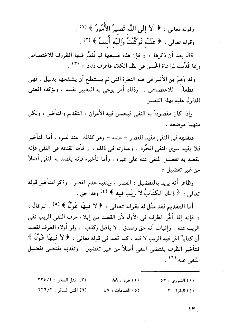 ثم قال: " فإنه إنما أخر الظرف في الأول لأن القصد من إيَلاء حرف النفي الريب نفى الريب عنه، وإثبات أنه حق وصدق. لا باطل وكذب. . ولو أولاه الظرف لقصد أن كتاباً آخر فيه الريب لا فيه، كما قصد في قوله تعالى: (لاَ فِيهَا غَولٌ) فتأخير الظرف يقتضي النفي أصلاً من غير تفضيل.