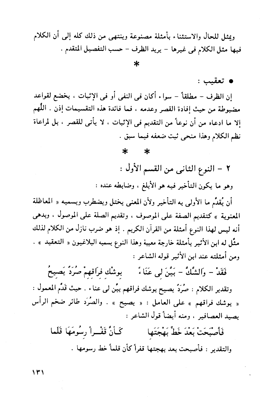 المعنوية " كتقديم الصفة على الموصوف، وتقديم الصلة على الوصول، وبدهي أنه ليس لهذا النوع أمثلة من القرآن الكريم. إذ هو ضرب نازل من الكلام لذلك مثل له ابن الأثير بأمثلة خارجة معيبة وهذا النوع يسميه البلاغيون " التعقيد ".