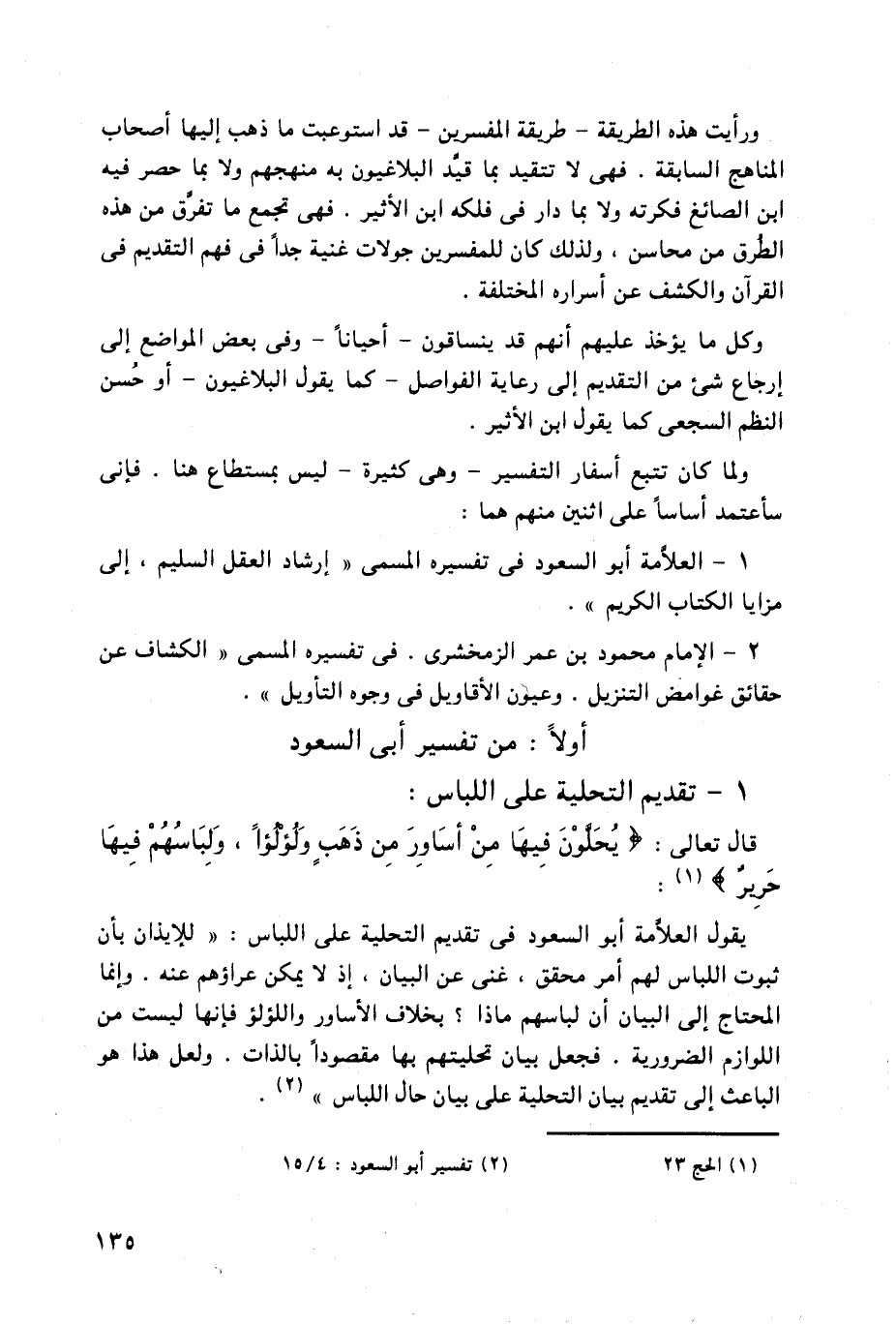ورأيت هذه الطريقة - طريقة المفسرين - قد استوعبت ما ذهب إليها أصحاب المناهج السابقة. فهى لا تتقيد بما قيَّد البلاغيون به منهجهم ولا بما حصر فيه ابن الصائغ فكرته ولا بما دار في فلكه ابن الأثير. فهى تجمع ما تفرق من هذه الطرق من محاسن، ولذلك كان للمفسرين جولات غنية جداً في فهم التقديم فى القرآن والكشف عن أسراره المختلفة.