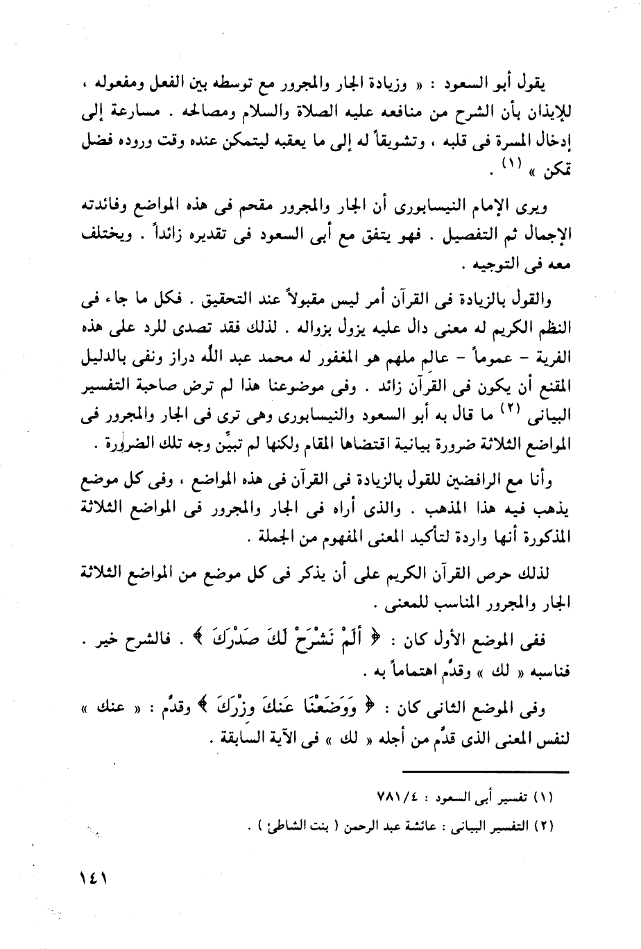 وفي موضوعنا هذا لم ترض صاحبة التفسير البياني ما قال به أبو السعود والنيسابورى وهي ترى في الجار والمجرور فى المواضع الثلاثة ضرورة بيانية اقتضاها المقام ولكنها لم تبين وجه تلك الضرورة.