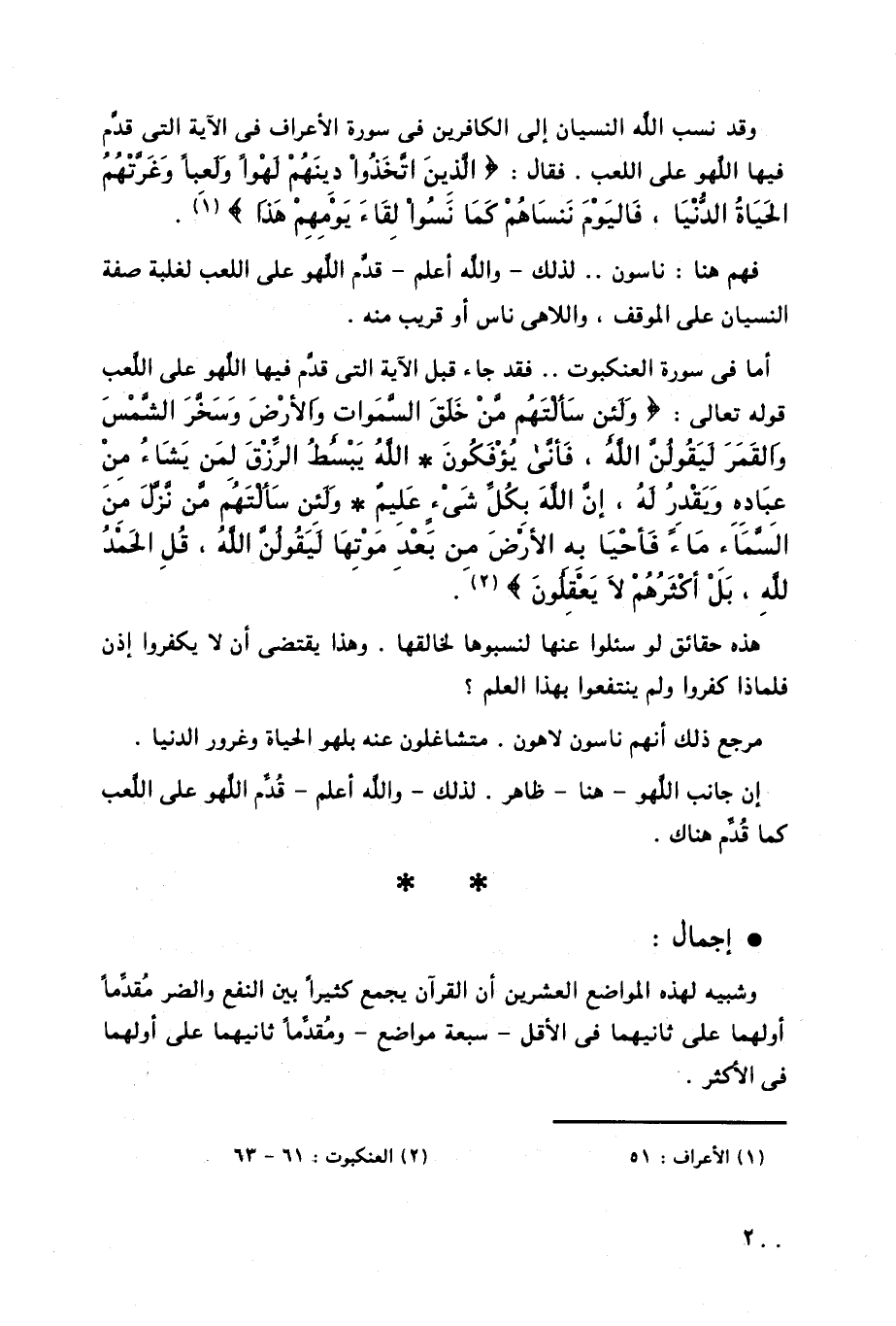 وشبيه لهذه المواضع العشرين أن القرآن يجمع كثيراً بين النفع والضر مُقدِّماً