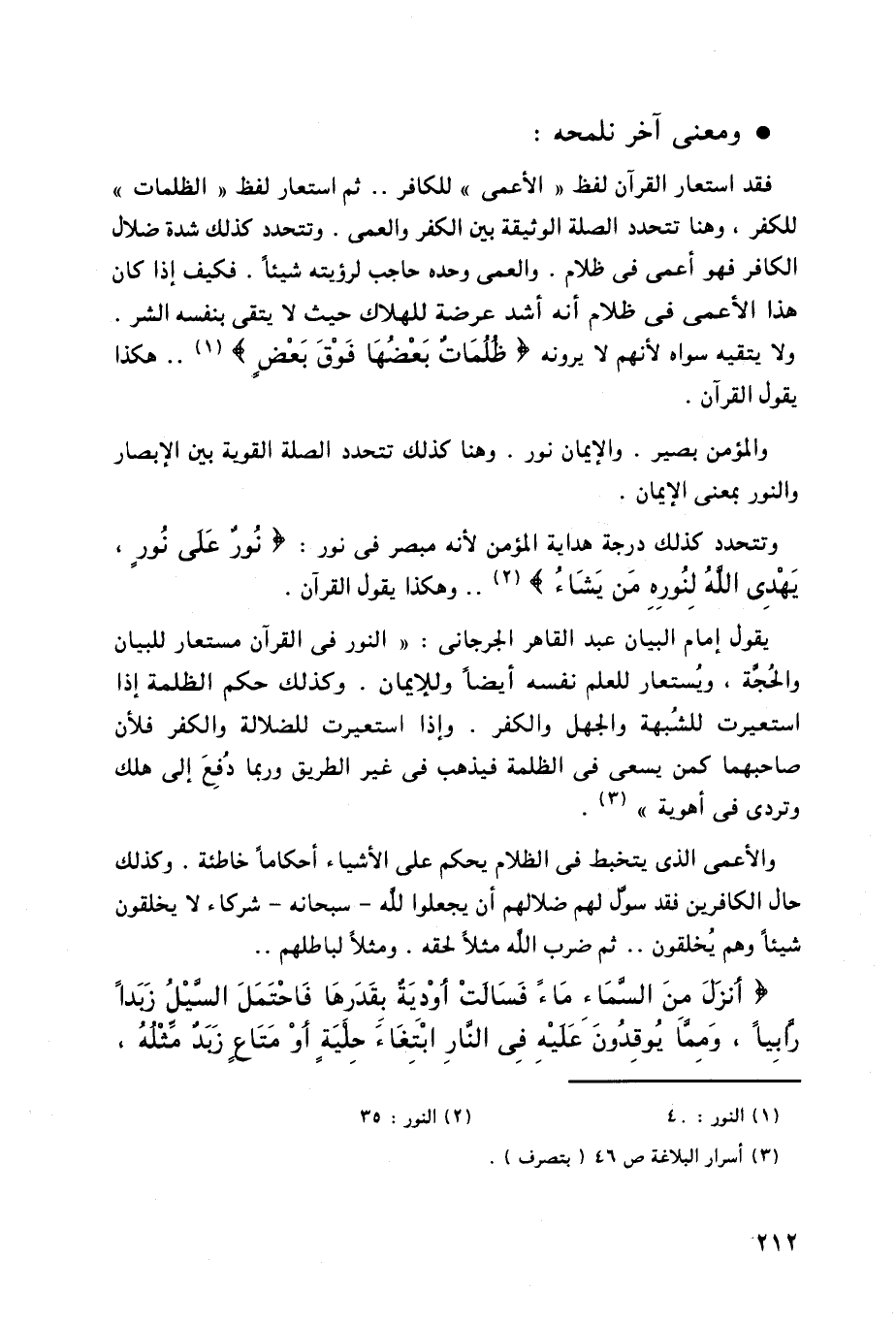 " النور في القرآن مستعار للبيان والحُجة، ويُستعار للعلم نفسه أيضاً وللإيمان. وكذلك حكم الظلمة إذا استعيرت للشُبهة والجهل والكفر.