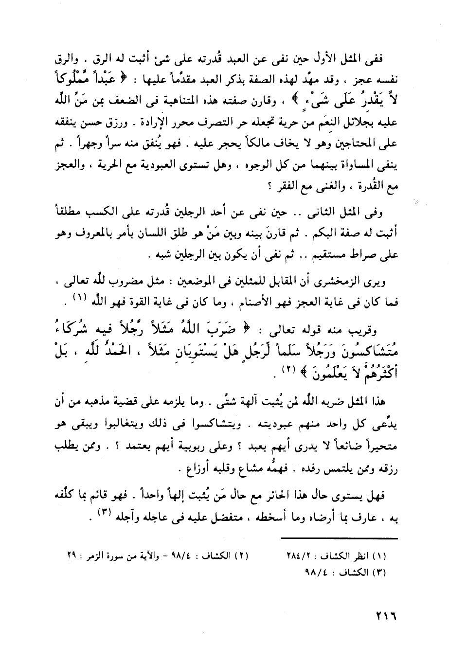 وقريب منه قوله تعالى: (ضَرَبَ اللَّهُ مَثَلًا رَجُلًا فِيهِ شُرَكَاءُ مُتَشَاكِسُونَ وَرَجُلًا سَلَمًا لِرَجُلٍ هَلْ يَسْتَوِيَانِ مَثَلًا الْحَمْدُ لِلَّهِ بَلْ أَكْثَرُهُمْ لَا يَعْلَمُونَ (29) .