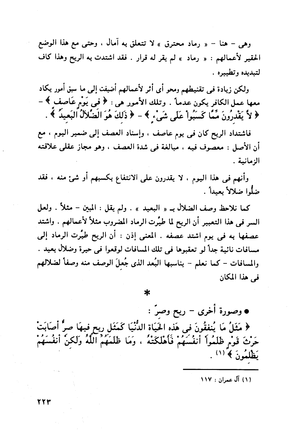 (مَثَلُ مَا يُنْفِقُونَ فِي هَذِهِ الْحَيَاةِ الدُّنْيَا كَمَثَلِ رِيحٍ فِيهَا صِرٌّ أَصَابَتْ حَرْثَ قَوْمٍ ظَلَمُوا أَنْفُسَهُمْ فَأَهْلَكَتْهُ وَمَا ظَلَمَهُمُ اللَّهُ وَلَكِنْ أَنْفُسَهُمْ يَظْلِمُونَ (117) .