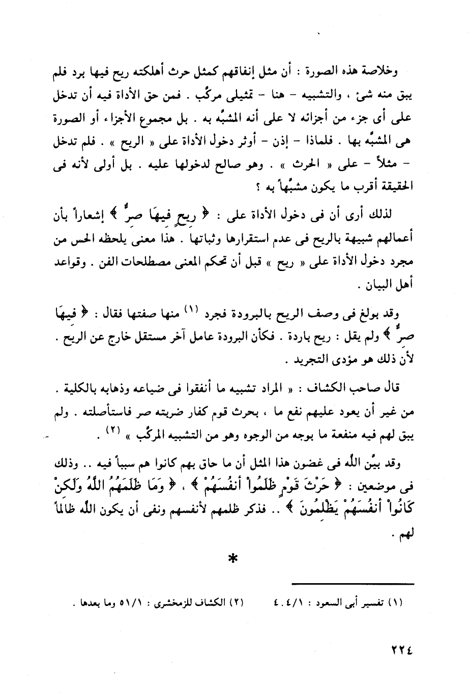وخلاصة هذه الصورة: أن مثل إنفاقهم كمثل حرث أهلكته ريح فيها برد فلم يبق منه شيء، والتشبيه - هنا - تمثيلي مركب.