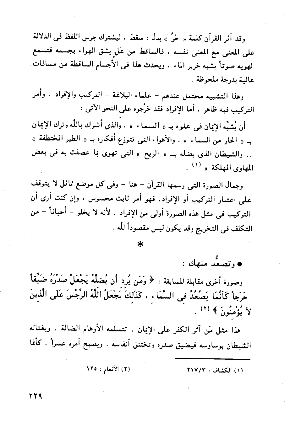 وصورة أخرى مقابلة للسابقة: (وَمَنْ يُرِدْ أَنْ يُضِلَّهُ يَجْعَلْ صَدْرَهُ ضَيِّقًا حَرَجًا كَأَنَّمَا يَصَّعَّدُ فِي السَّمَاءِ كَذَلِكَ يَجْعَلُ اللَّهُ الرِّجْسَ عَلَى الَّذِينَ لَا يُؤْمِنُونَ (125) .
