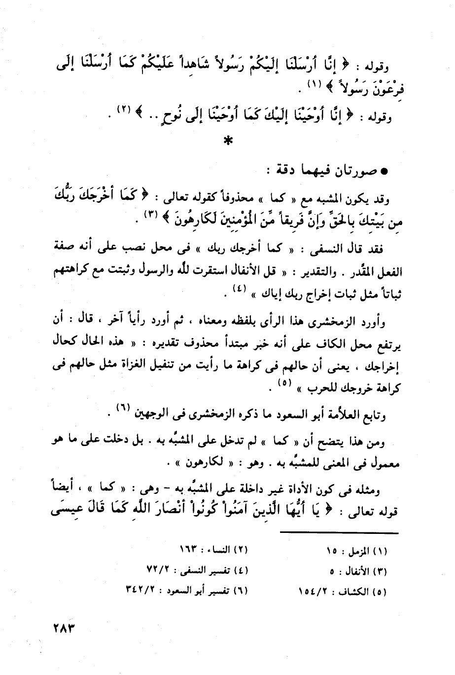 وقد يكون المشبه مع " كما " محذوفاً كقوله تعالى: (كَمَا أَخْرَجَكَ رَبُّكَ مِنْ بَيْتِكَ بِالْحَقِّ وَإِنَّ فَرِيقًا مِنَ الْمُؤْمِنِينَ لَكَارِهُونَ (5) .
