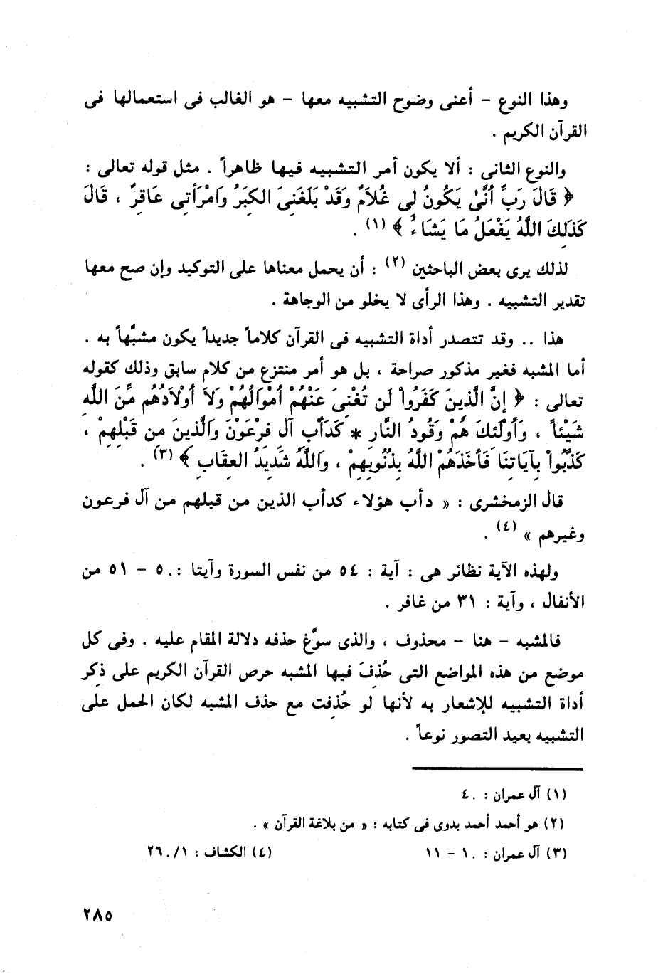 وفي كل موضع من هذه المواضع التي حُذفَ فيها المشبه حرص القرآن الكريم على ذكر أداة التشبيه للإشعار به لأنها لو حُذفت مع حذف المشبه لكان الحمل على التشبيه بعيد التصور نوعا.
