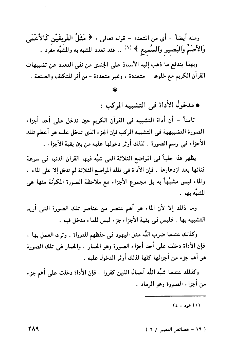 ومنه أيضاً - أي من المتعدد - قوله تعالى: (مَثَلُ الْفَرِيقَيْنِ كَالْأَعْمَى وَالْأَصَمِّ وَالْبَصِيرِ وَالسَّمِيعِ) . . فقد تعدد المشبه به والمشبَّه مفرد.