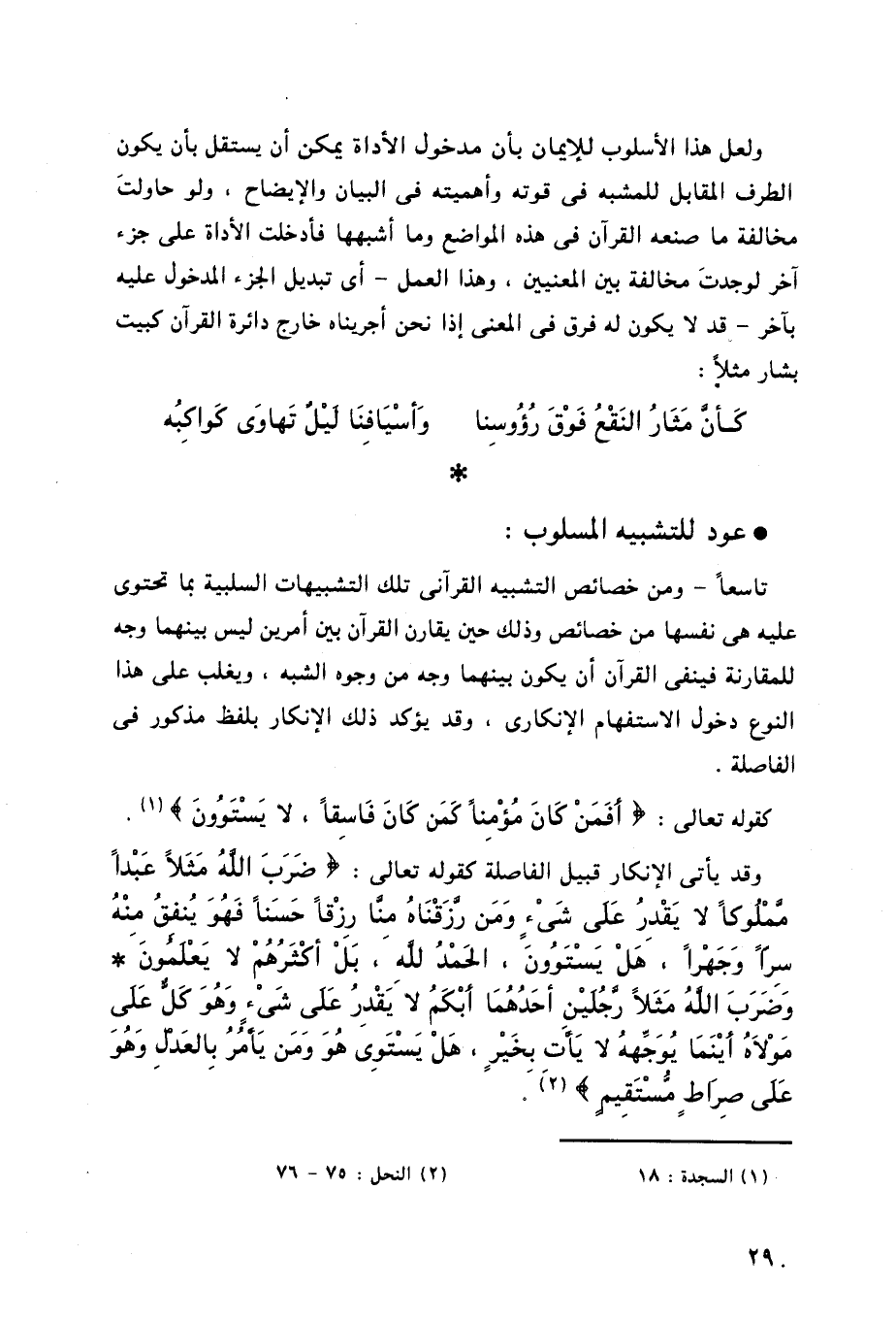 عليه هي نفسها من خصائص وذلك حين يقارن القرآن بين أمرين ليس بينهما وجه للمقارنة فينفى القرآن أن يكون بينهما وجه من وجوه الشبه، ويغلب على هذا النوع دخول الاستفهام الإنكارى، وقد يؤكد ذلك الإنكار بلفظ مذكور فى الفاصلة،