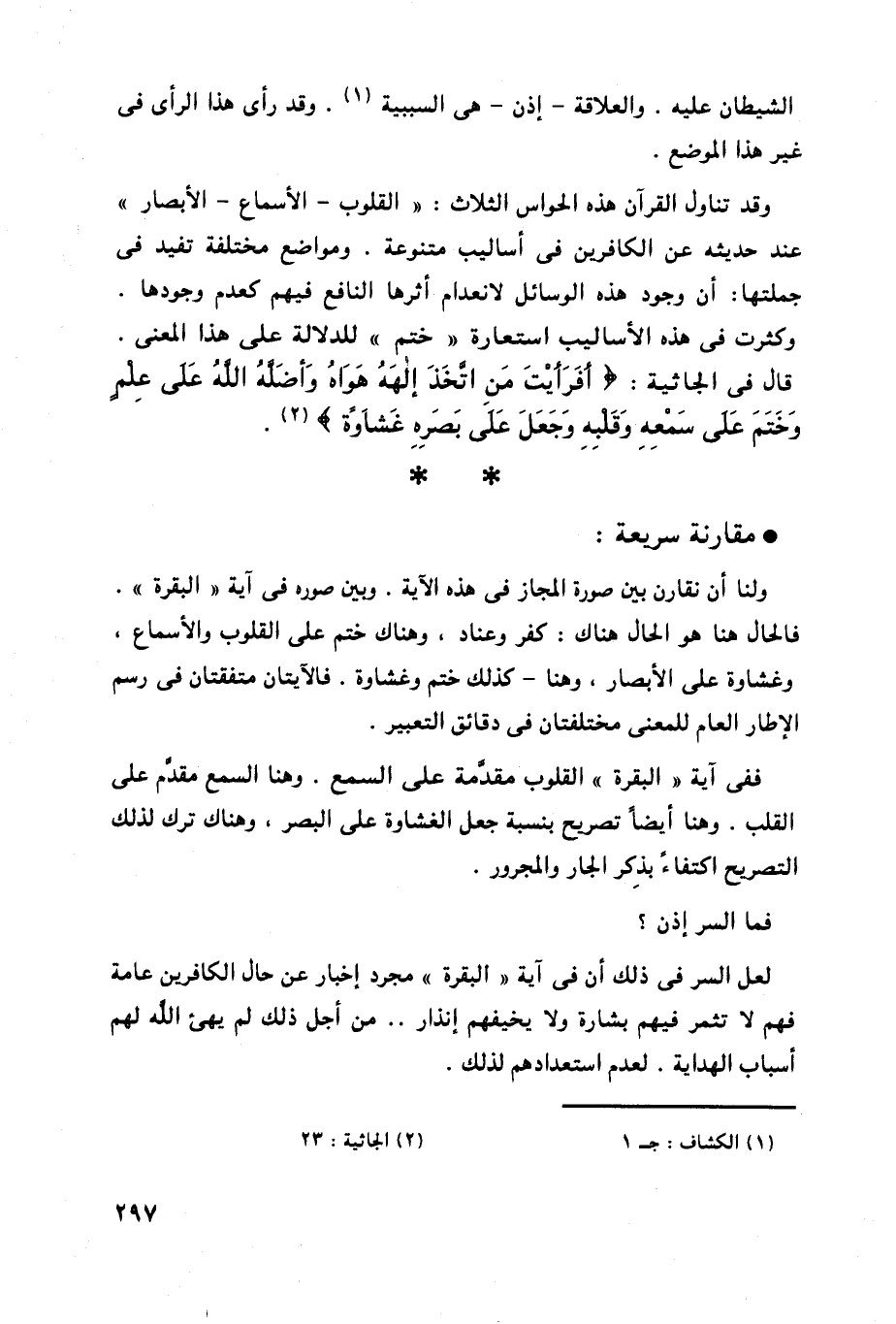فالحال هنا هو الحال هناك: كفر وعناد، وهناك ختم على القلوب والأسماع، وغشاوة على الأبصار، وهنا - كذلك ختم وغشاوة. فالآيتان متفقتان في رسم الإطار العام للمعنى مختلفتان في دقائق التعبير.