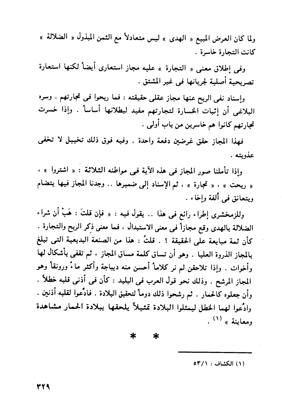 " فإن قلتَ: هَبْ أن شراء الضلالة بالهدى وقع مجازاً في معنى الاستبدال، فما معنى ذكر الربح والتجارة. كأن ثمة مبايعة على الحقيقة؟.