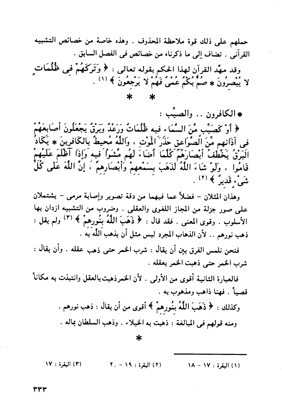 (أَوْ كَصَيِّبٍ مِنَ السَّمَاءِ فِيهِ ظُلُمَاتٌ وَرَعْدٌ وَبَرْقٌ يَجْعَلُونَ أَصَابِعَهُمْ فِي آذَانِهِمْ مِنَ الصَّوَاعِقِ حَذَرَ الْمَوْتِ وَاللَّهُ مُحِيطٌ بِالْكَافِرِينَ (19) يَكَادُ الْبَرْقُ يَخْطَفُ أَبْصَارَهُمْ كُلَّمَا أَضَاءَ لَهُمْ مَشَوْا فِيهِ وَإِذَا أَظْلَمَ عَلَيْهِمْ قَامُوا وَلَوْ شَاءَ اللَّهُ لَذَهَبَ بِسَمْعِهِمْ وَأَبْصَارِهِمْ إِنَّ اللَّهَ عَلَى كُلِّ شَيْءٍ قَدِيرٌ (20)