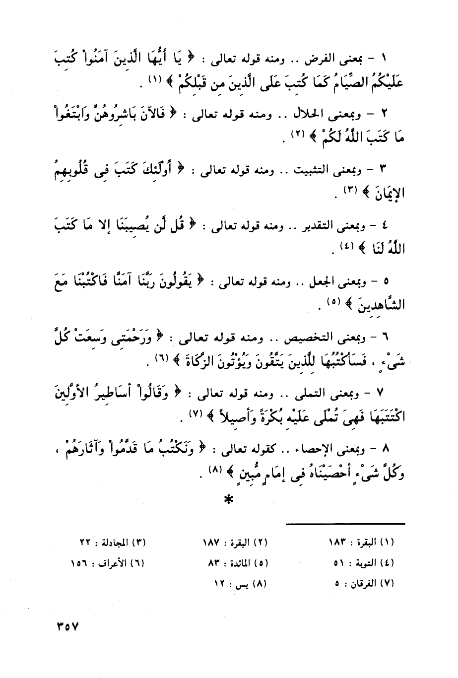 1 - بمعنى الفرض. . ومنه قوله تعالى: (يَا أَيُّهَا الَّذِينَ آمَنُوا كُتِبَ عَلَيْكُمُ الصِّيَامُ كَمَا كُتِبَ عَلَى الَّذِينَ مِنْ قَبْلِكُمْ) .