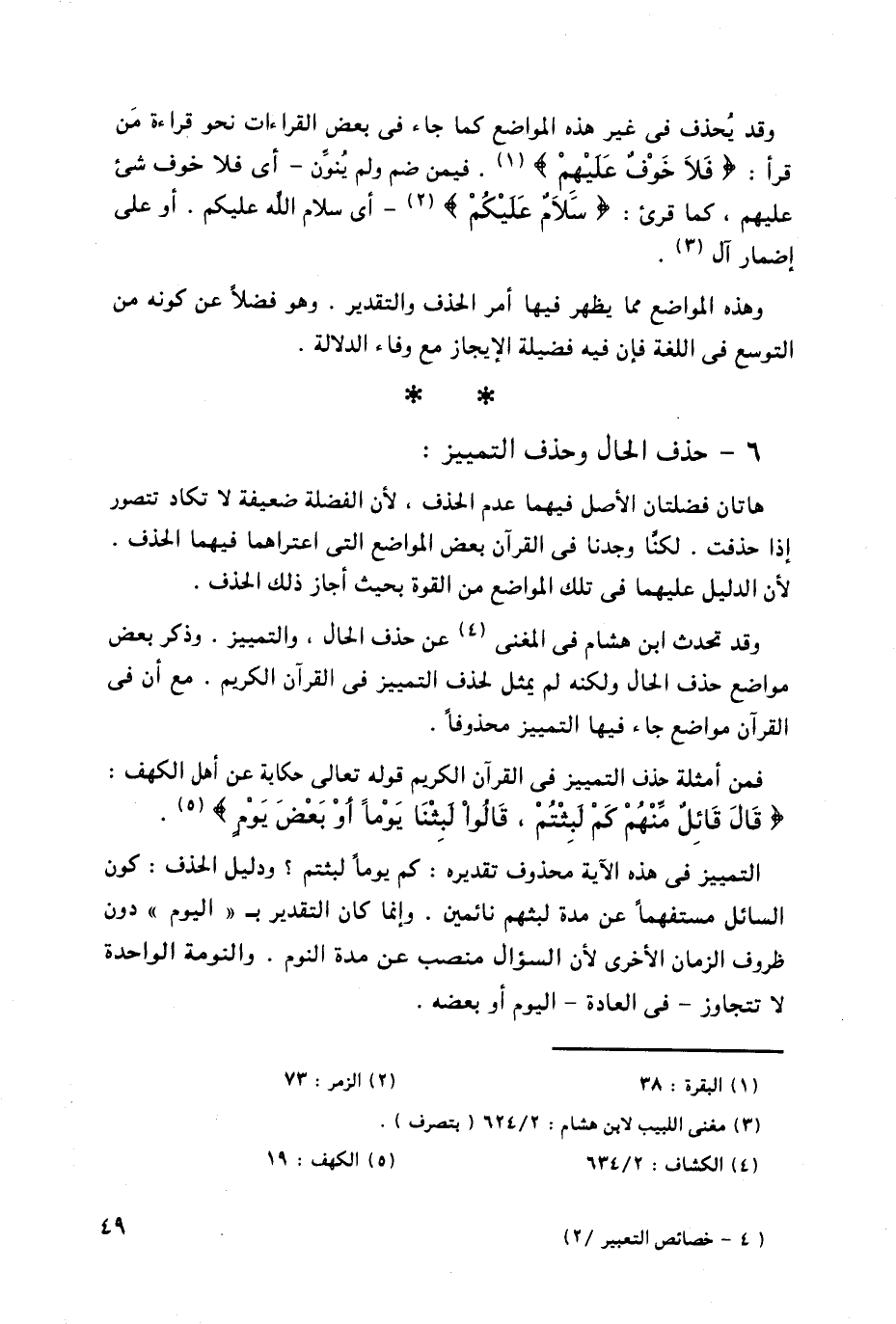 وذكر بعض مواضع حذف الحال ولكنه لم يمثل لحذف التمييز في القرآن الكريم.
